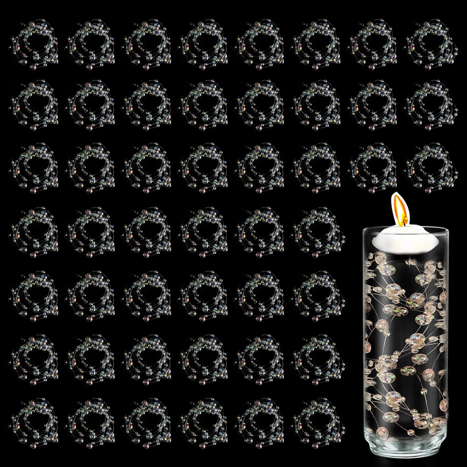 - Pearl String Beads: These artificial fake pearls strands are designed for floating candles, easy to use, just fill the string beads into the floating candle glass candle holders; you can also fill the vase with water and add 2 or 3 strands of beads string, which will make the centerpiece more romantic and gorgeous, for tall or large vases, just fill it with more strands of pearl decorations to bring a rich and luxurious look to your precious vase filler