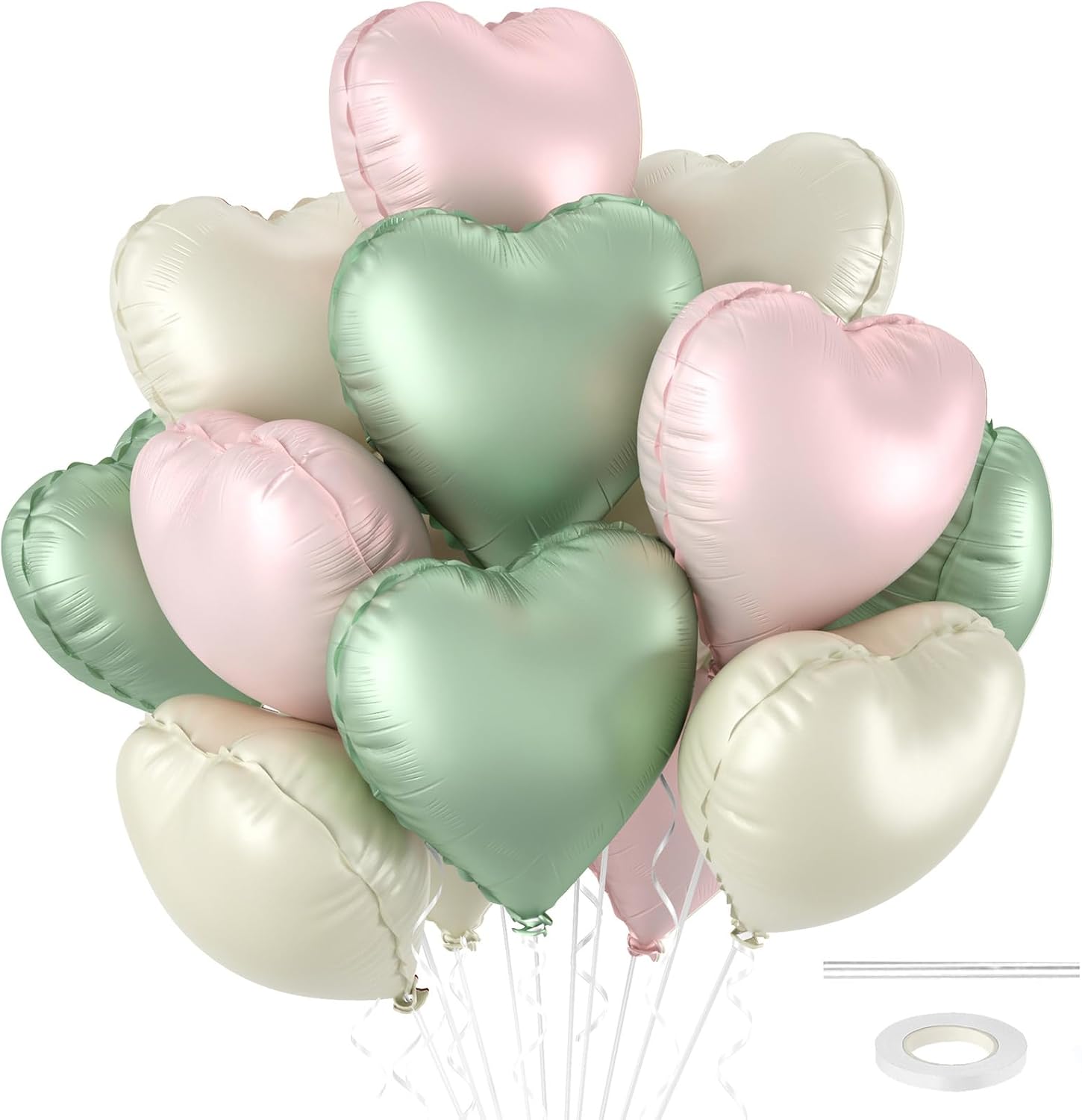 - Sage Green Pink Heart Balloons:This 18 inches heart shaped balloons includes 4* sage green heart balloons, 4* retro pink heart balloons, 4* cream white heart balloons, 1* ribbon, 1*straw, adding romance and warmth to your celebration. These large heart balloons will be the highlight of your party decorations, creating an atmosphere of love for everyone.