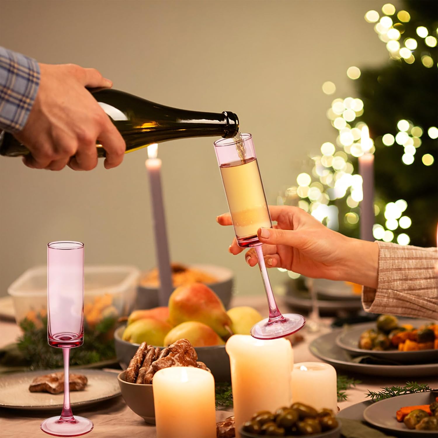 6 Pieces Pink Champagne Flutes 6 OZ Straight Sided Wine Glasses Champagne Long Stem Drinking Colored Glasses,Set of 6 Hand Blown Champagne Flutes Goblets for Wedding Cocktail Cups,Cava, Prosecco