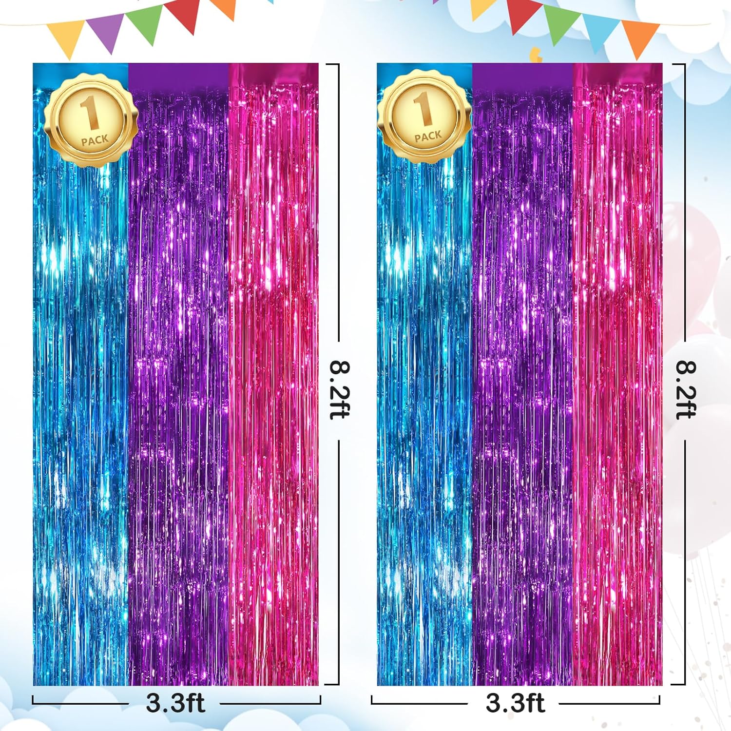 - Materials. The package contains 2 packs of aluminum foil tassel curtains with a size of 3.3 x 8.3ft. It is long enough for any occasion. Please do not stick aluminum foil Streamers curtains to uneven or stained walls to prevent them from falling off