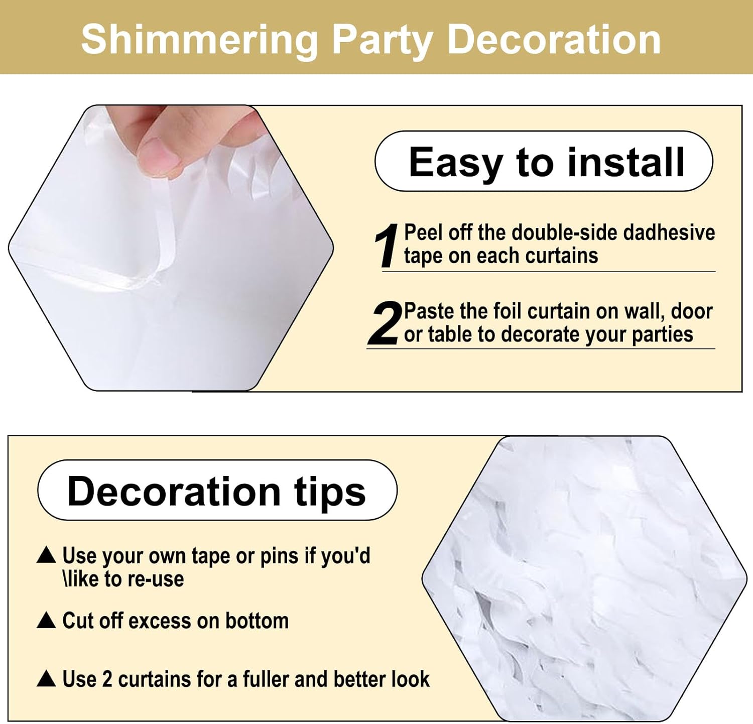 - Easy To Assemble | Strong Adhesive | Not Easy Fade : The foil fringe curtain backdrop party decorations come with double-sided adhesive tape, easy to use, just tear off the back of adhesive tape, then paste this streamers backdrop curtains on the top of wall, window, table, or as door fringe decoration.