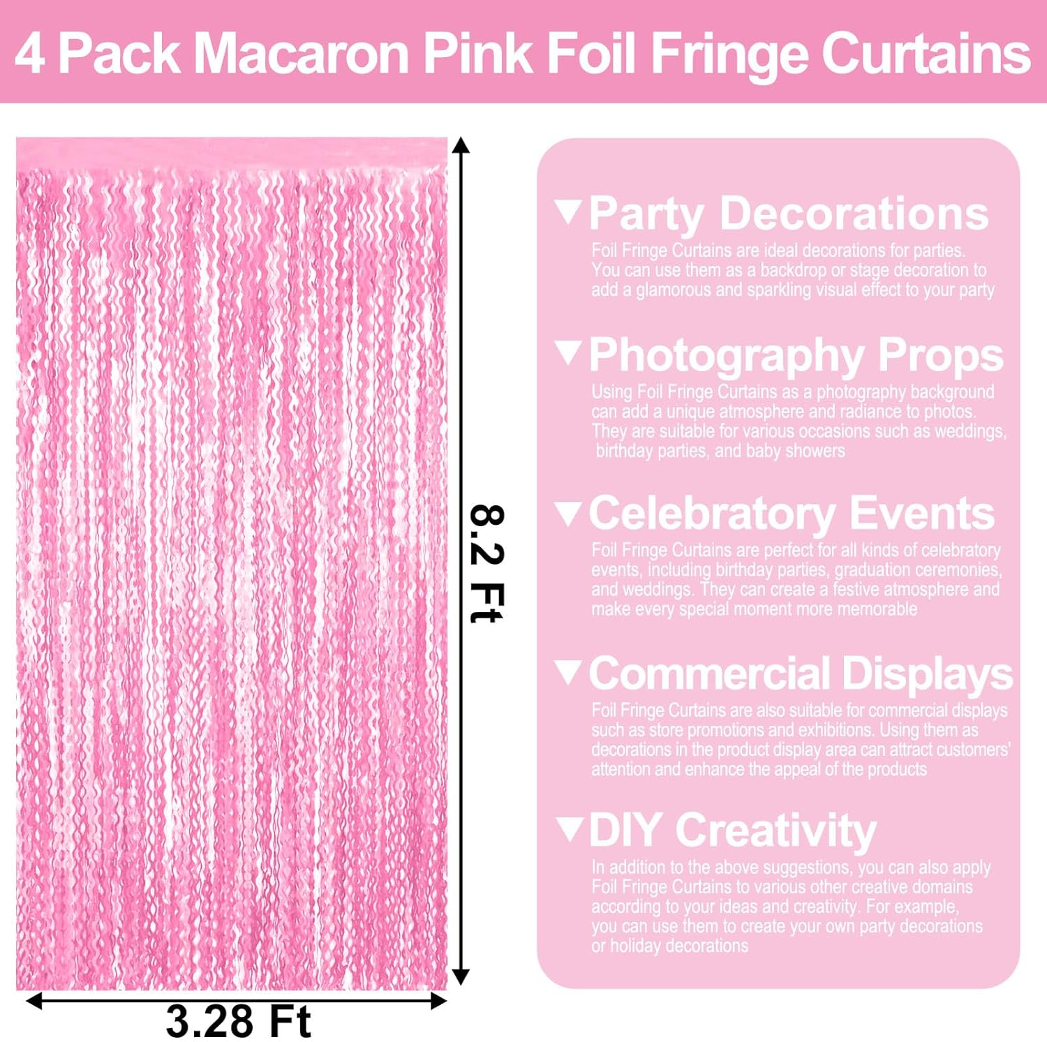 4 Pack Macaron Pink Wave Foil Fringe Curtain Backdrop, 3.28Ft x 8.2Ft Metallic Tinsel Foil Fringe Streamer Curtains for Photo Booth, Mother's Day, Easter, Birthday, Wedding Party Decoration