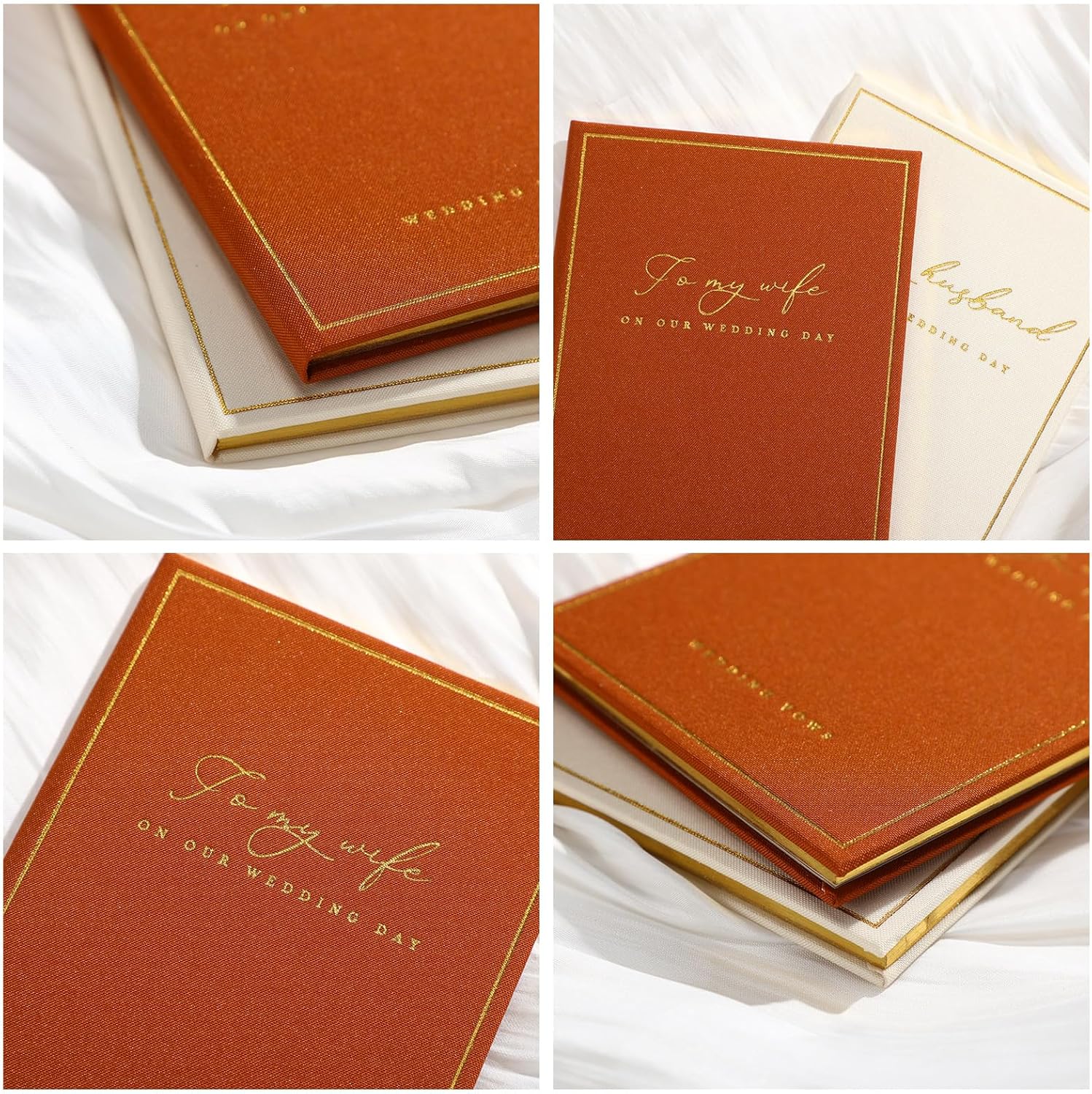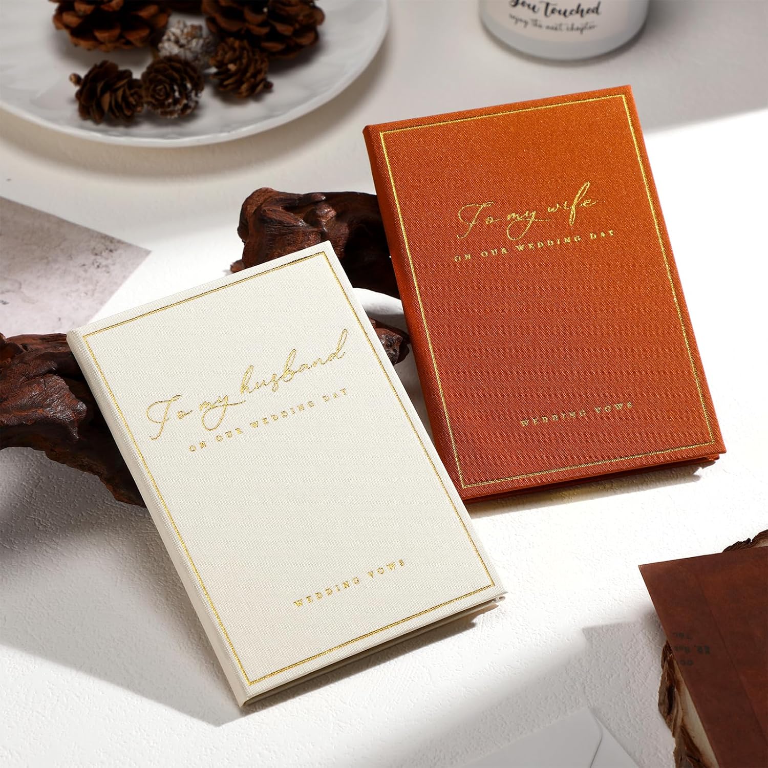 - Elegant Wedding Vow Books: you will receive two pieces wedding vow books, printed with [To my husband] and [To my wife]. These two books have gold foil cover and gold edges, which will add a refined and elegant feeling to the vow books. Whether you use them at the ceremony or keep them as souvenirs, these exquisite vow books are the nice souvenirs for exchanging vows on your special day