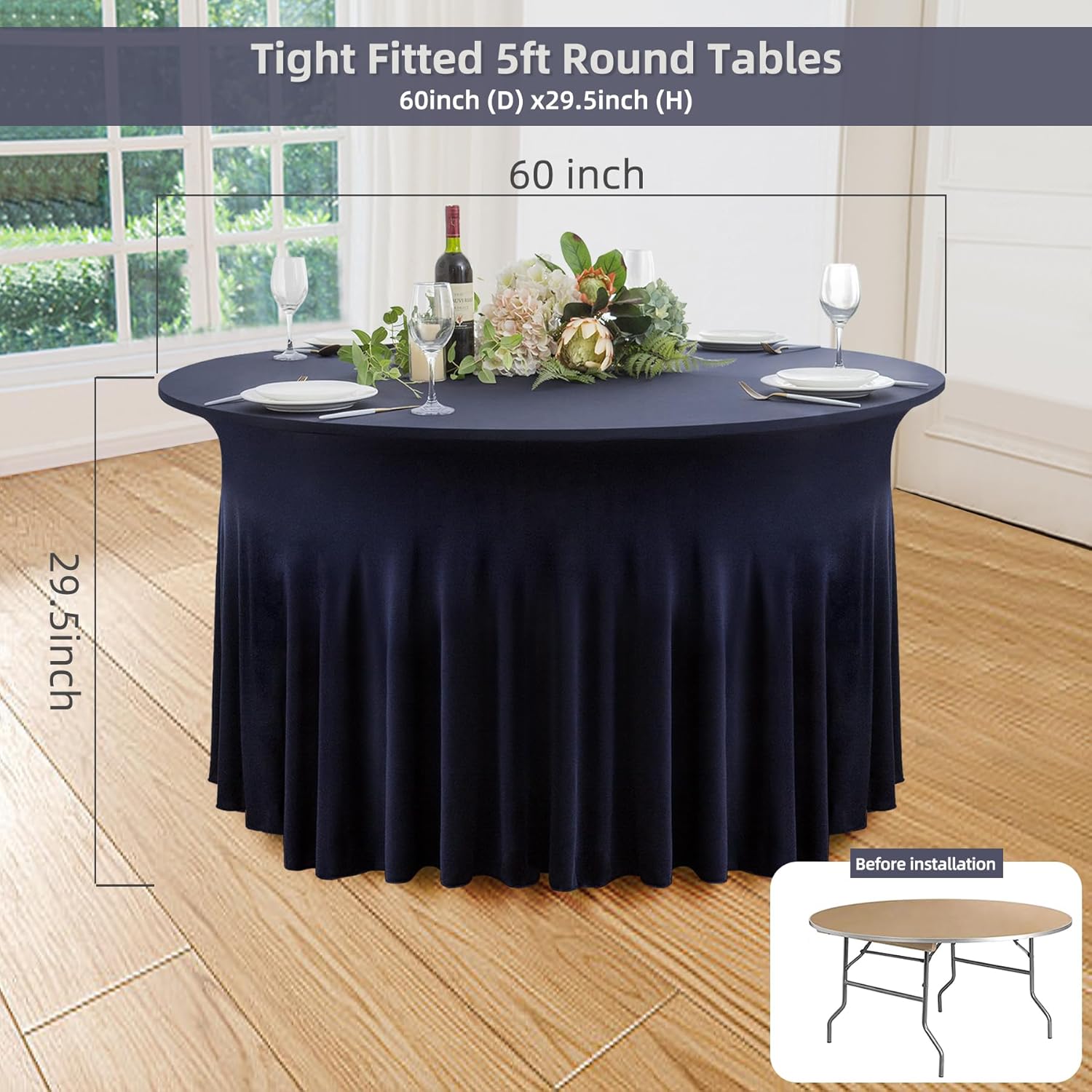 - 【Navy Blue Round Spandex Tablecloth 60 Inch】 - Your Package will come with 6 pack Navy Blue round spandex tablecloths 120 inch,the diameter of each tablecloth is 60 inches and 29inch in height,tighy fitted 5ft round party tables.Manteles de mesa de tela para fiestas.