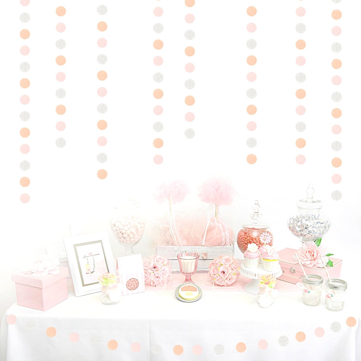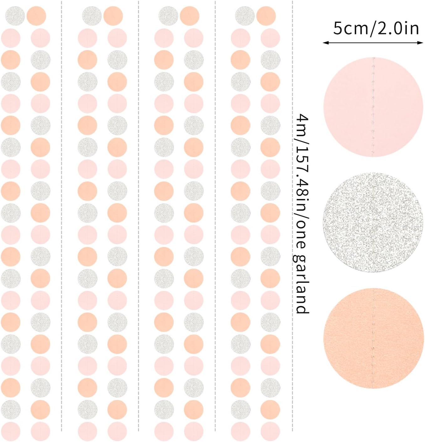 - PACKAGE CONTAINS: This set has four pink silver peach paper circle garland,the length of each strand is 4 meters/13.1 feet, the total length is 16 meters/52.5 feet.The size is 2IN.