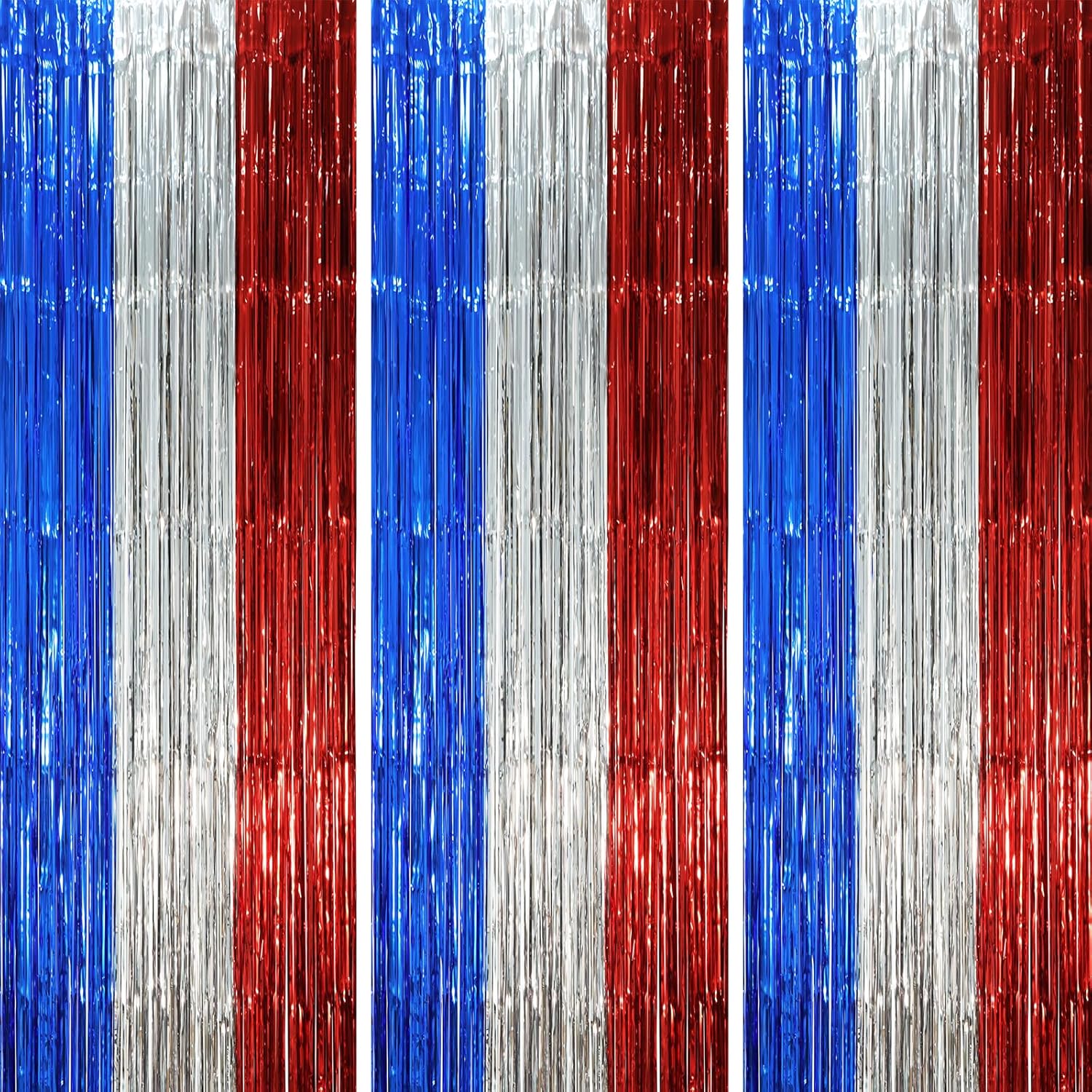3 Pack 3.3 x 8.2 ft Blue Red Silver Foil Fringe Backdrop Curtains, Tinsel Streamers Party Decorations, Fringe Backdrop, Door Shimmer for Independence Day or Birthday Party