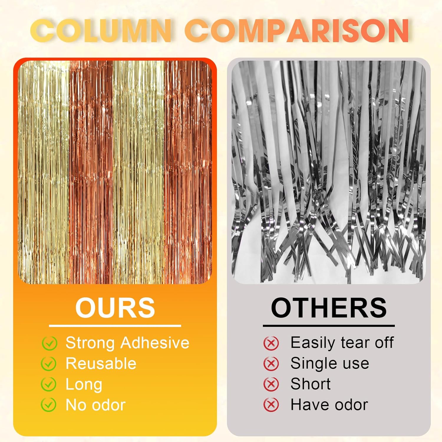 - Easy to Assemble: The back of the rose gold and champion fringe curtain has double-sided tape, which can be stuck very firmly to any place you want such as walls, tables, door frames. You can use scissors to cut the length you want, and you can use two or more pieces of the curtain to splice and overlap to achieve unexpected effects