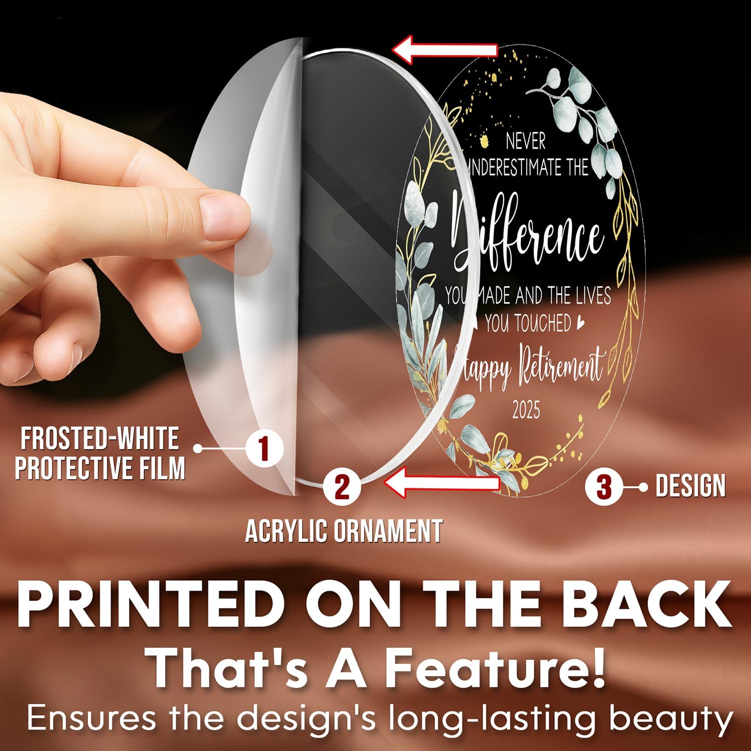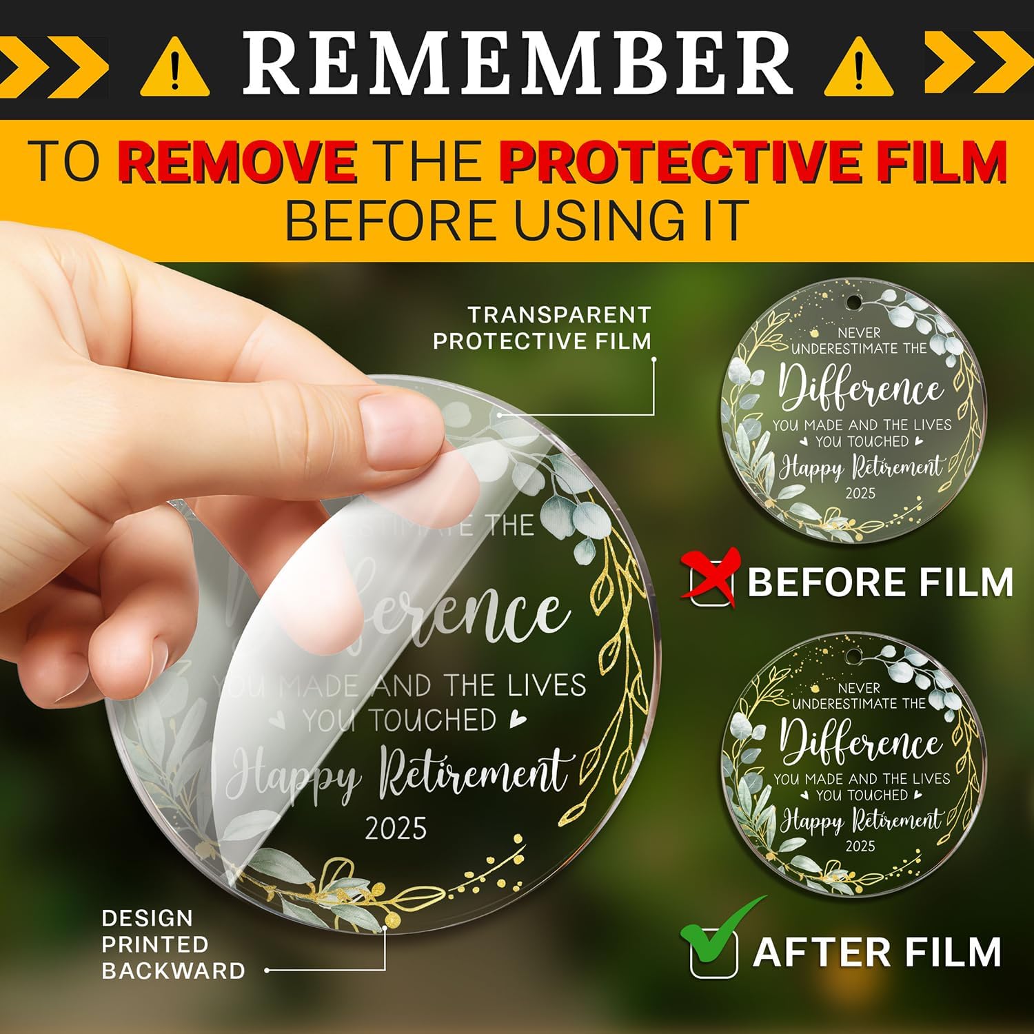 - ACRYLIC MATERIAL: Made from acrylic with a transparent protective film on the front to prevent scratches. The design is printed on the back, and to fully appreciate the ornament's beauty, remove the protective film to reveal the clear acrylic finish