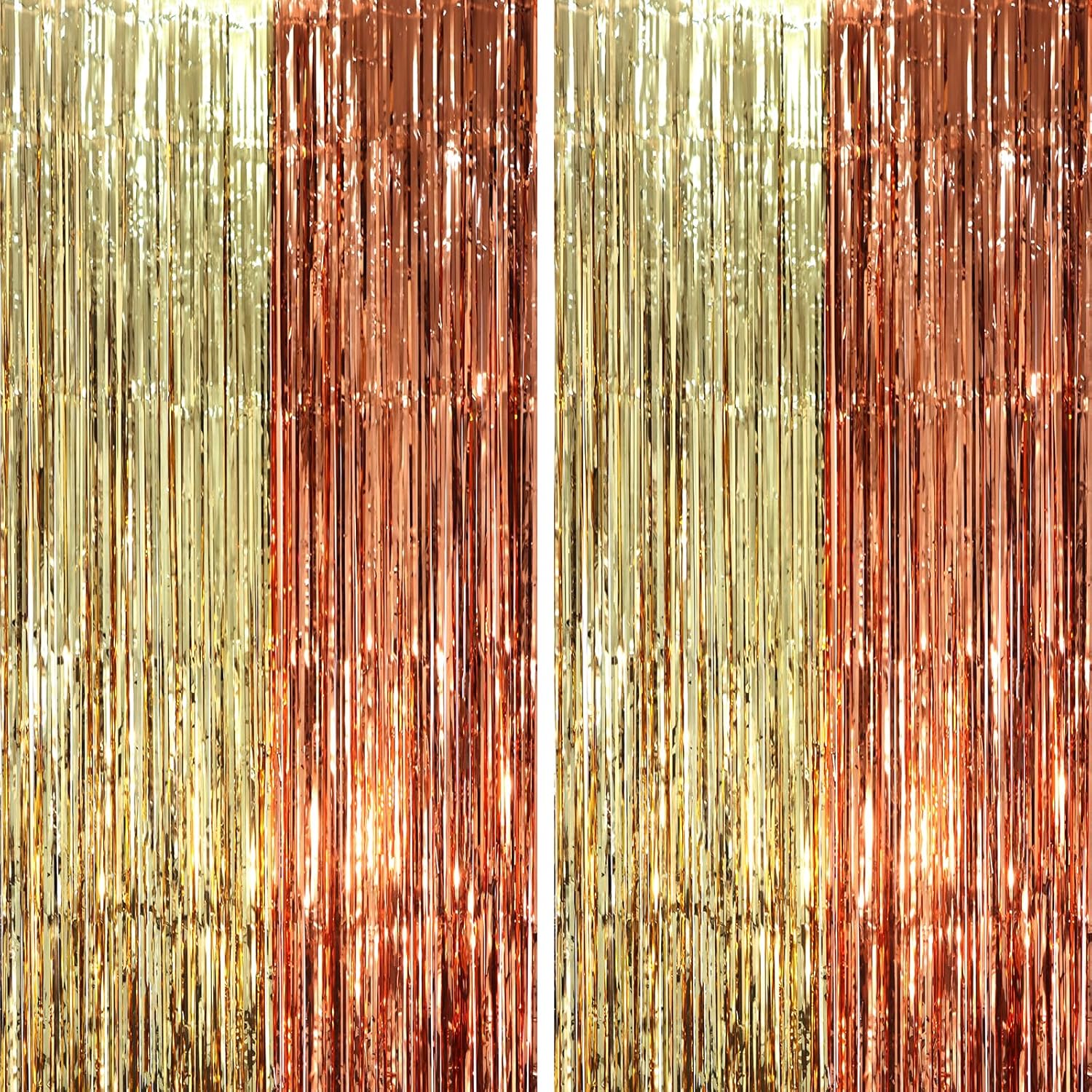 - Stunning Decorative Set: You'll receive 2pcs rose gold and champion foil fringe backdrop curtains, each measuring 3.28 ft (wide)×6.56 ft (drop). Enough length foil fringe curtains backdrops are perfect for the door or wall to create an impressive decoration