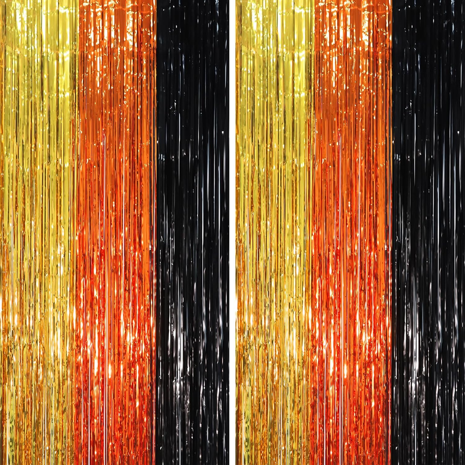 - Stunning Decorative Set: You'll receive 2 pcs black gold orange foil fringe backdrop curtains, each measuring 3.28 ft (wide)×6.56 ft (drop). Enough length foil fringe curtains backdrops are perfect for the door or wall to create an impressive decoration