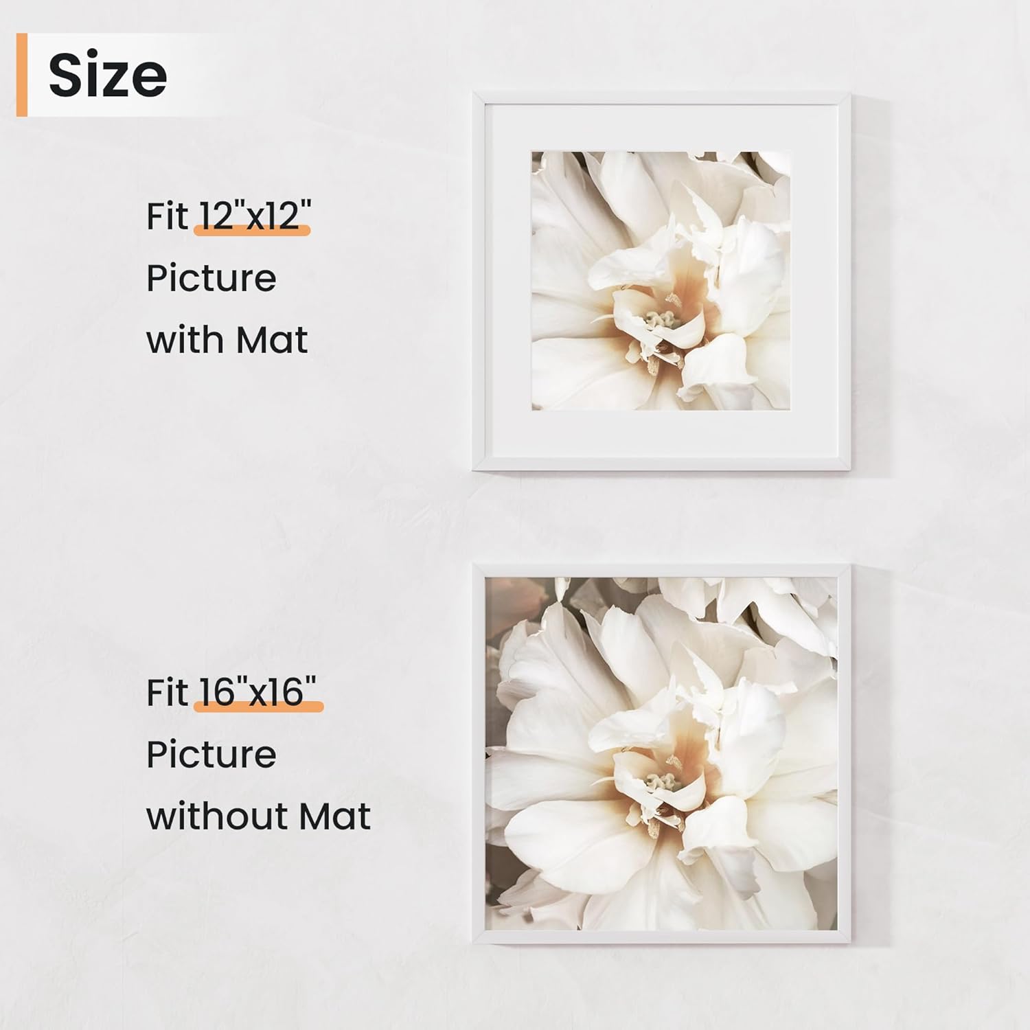 - Display Precious Memories - Showcase your cherished moments with our 16x16 plastic frame. It's lightweight yet sturdy with a superior quality finish. The white mat opening (measuring 11.5x11.5) is perfect for a 12x12 picture with the mat, or an 16x16 picture without it.