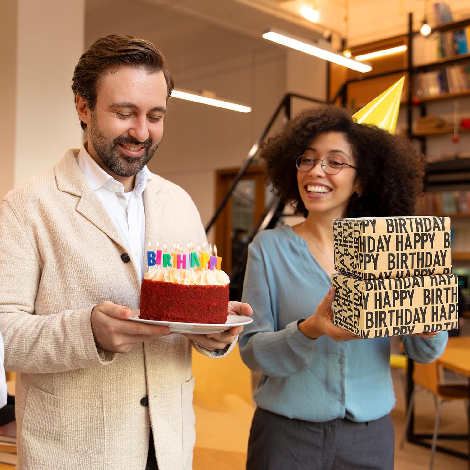 - MODERN BIRTHDAY WRAPPING PAPER: Featuring sleek black Happy Birthday text on classic kraft paper, combines a rugged yet sophisticated look. It’s the perfect pick for men—modern, minimal, and timeless, making every gift look sharp and classy