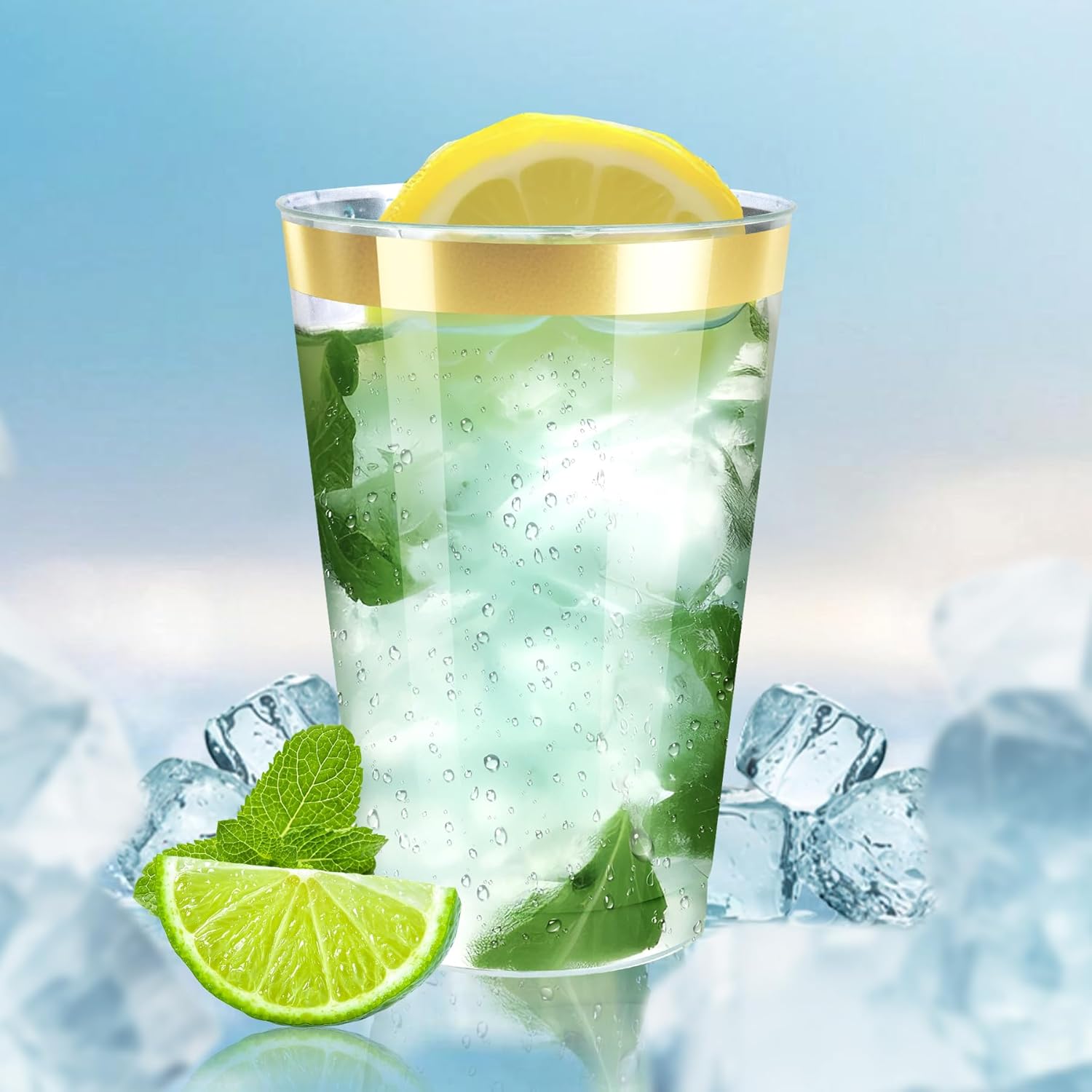 12oz Clear Plastic Cups with Gold Rimmed Sturdy & Food Safe Disposable Wine Glasses Wedding Cups Party Cups Plastic Cocktail Glasses for Wine, Juice, Cocktails and Cold Beverages [100 Pack]