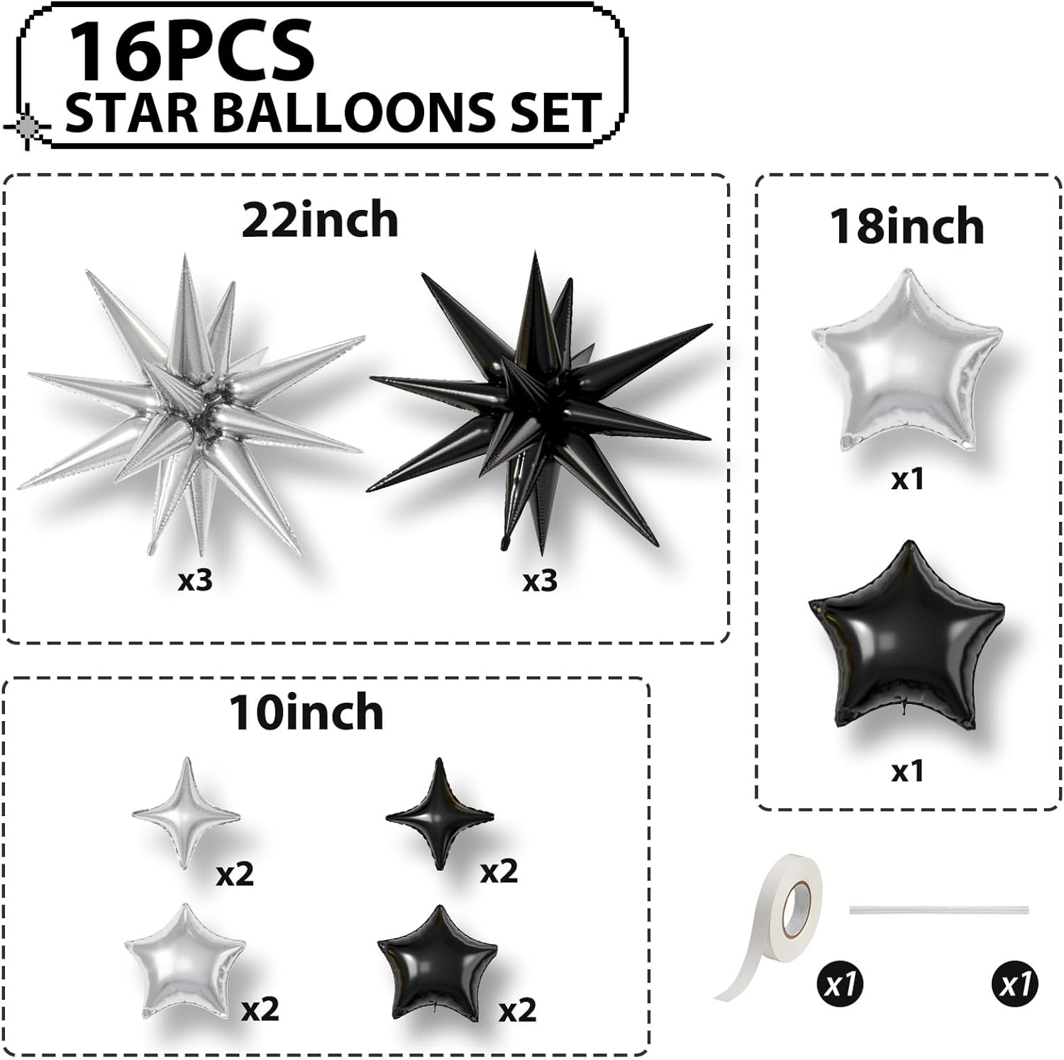 - ăSilver Black Star BalloonsăThe package includes:6pcs 22-inch Star-Shape balloons(Silver*3,Black*3), 4pcs 10-inch Four-Pointed Star balloons(Silver*2,Black*2), 2pcs 18-inch Five-Pointed Star balloons(Silver*1,Black*1), 4pcs 10-inch Five-Pointed Star Shape balloons(Silver*2,Black*2),1 dispense and 1 straw. These foil star balloons are Great for birthdays, weddings, baby showers, and engagement parties