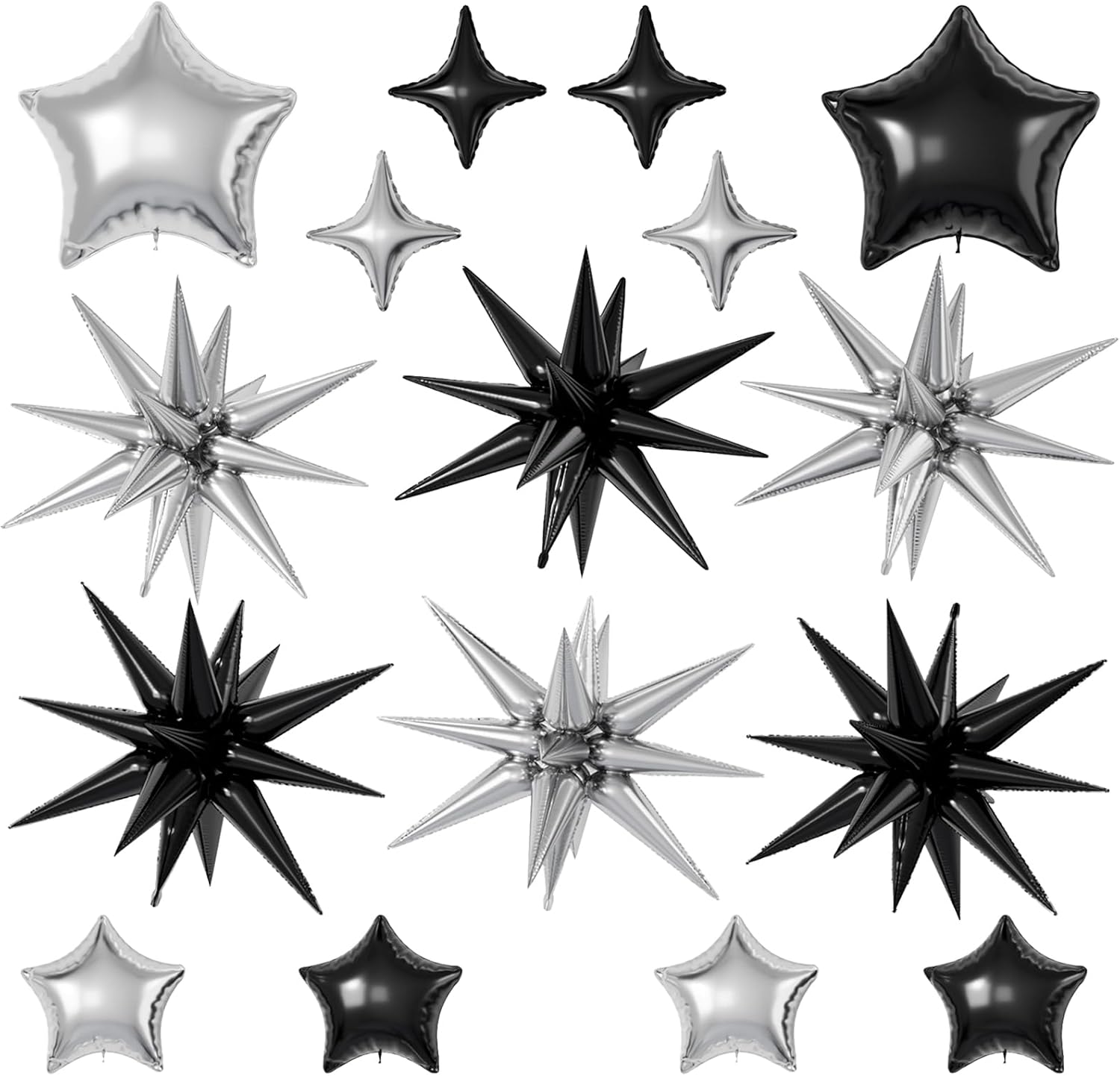 16 Pcs Black Silver Star Balloons,22/18/10 Inch Foil Balloons, Four-Pointed Balloon for Birthday Graduation Anniversary Wedding Baby Shower Party Decorations