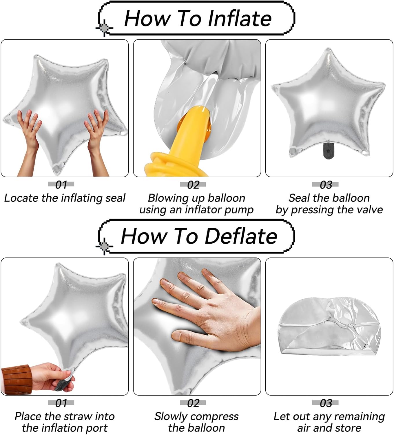 - ăEffortless SetupăInflate with helium or air using a pump and secure easily for polished decor. These Star Foil balloons are simple to assemble and reusable for multiple events, making decorating quick and effortless.