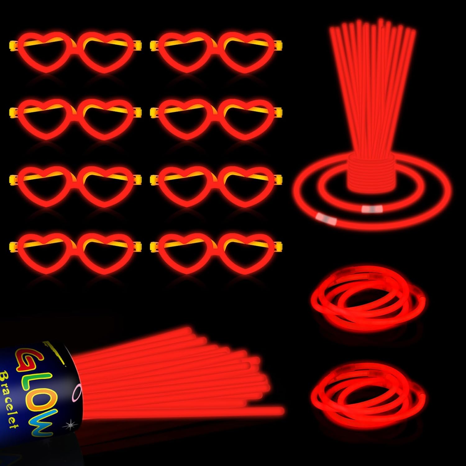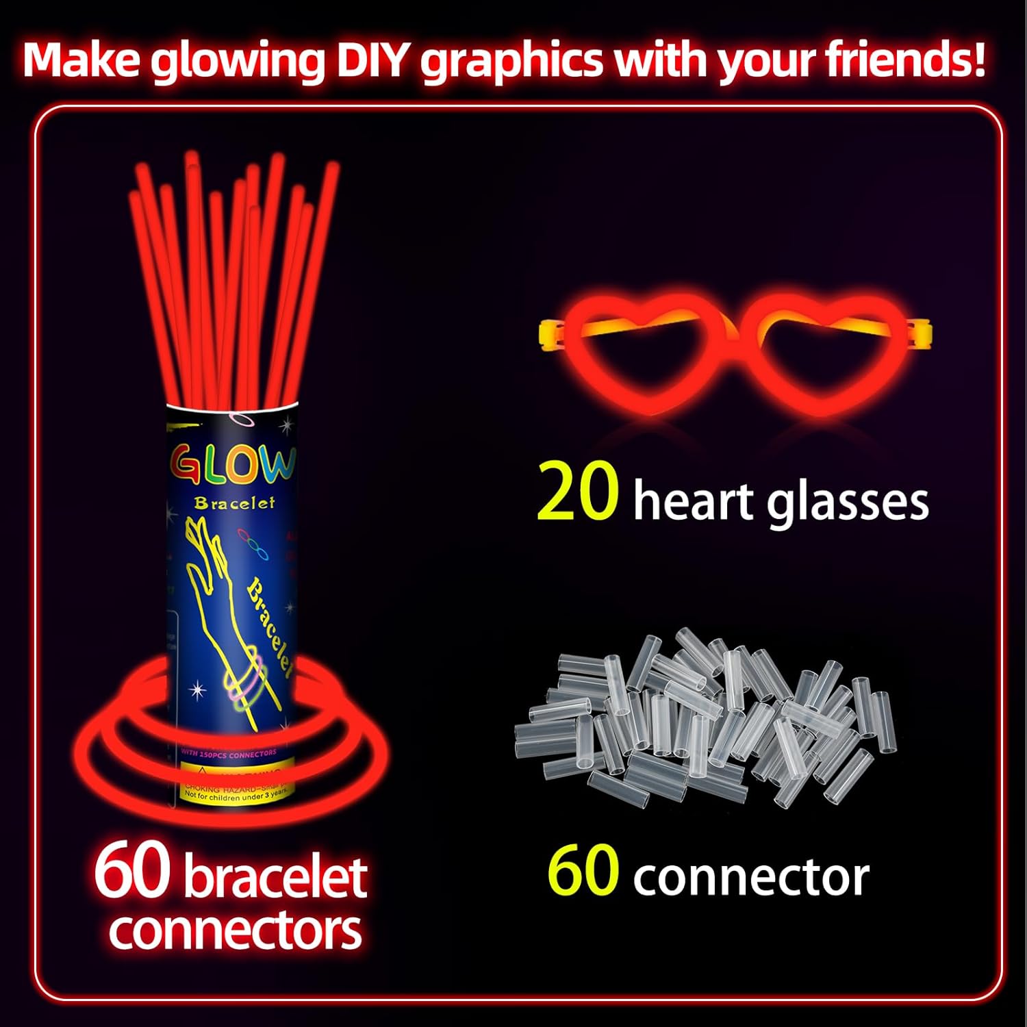 - 20 Set Glow In The Dark Party Supplies: You will receive 60 glow sticks, 60 connectors and 20 heart glasses, and you can easily make 20 glow stick bracelets and 20 glow heart glasses. Have a fun evening with your friends! (Note: if only 20 glasses are made, there will be an excess of 40 connectors)