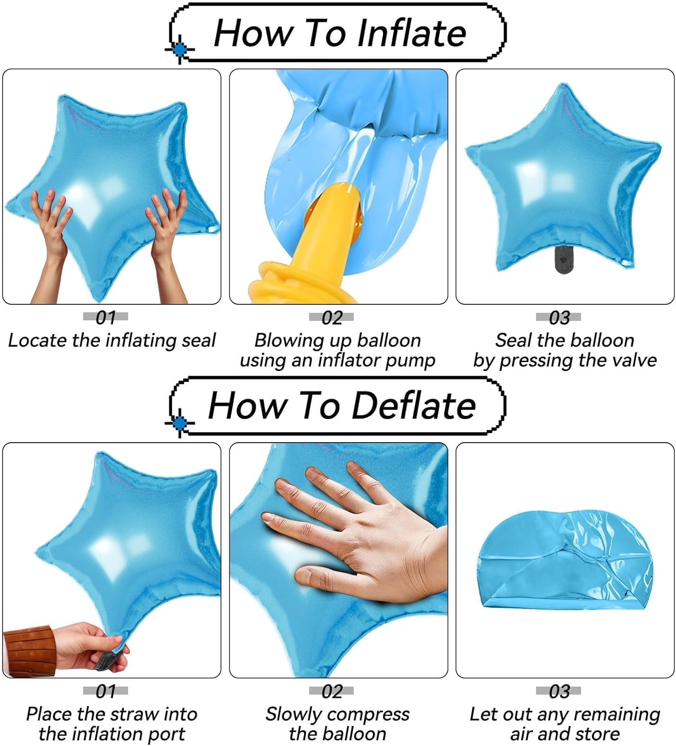 - ăEffortless SetupăInflate with helium or air using a pump and secure easily for polished decor. These Star Foil balloons are simple to assemble and reusable for multiple events, making decorating quick and effortless.