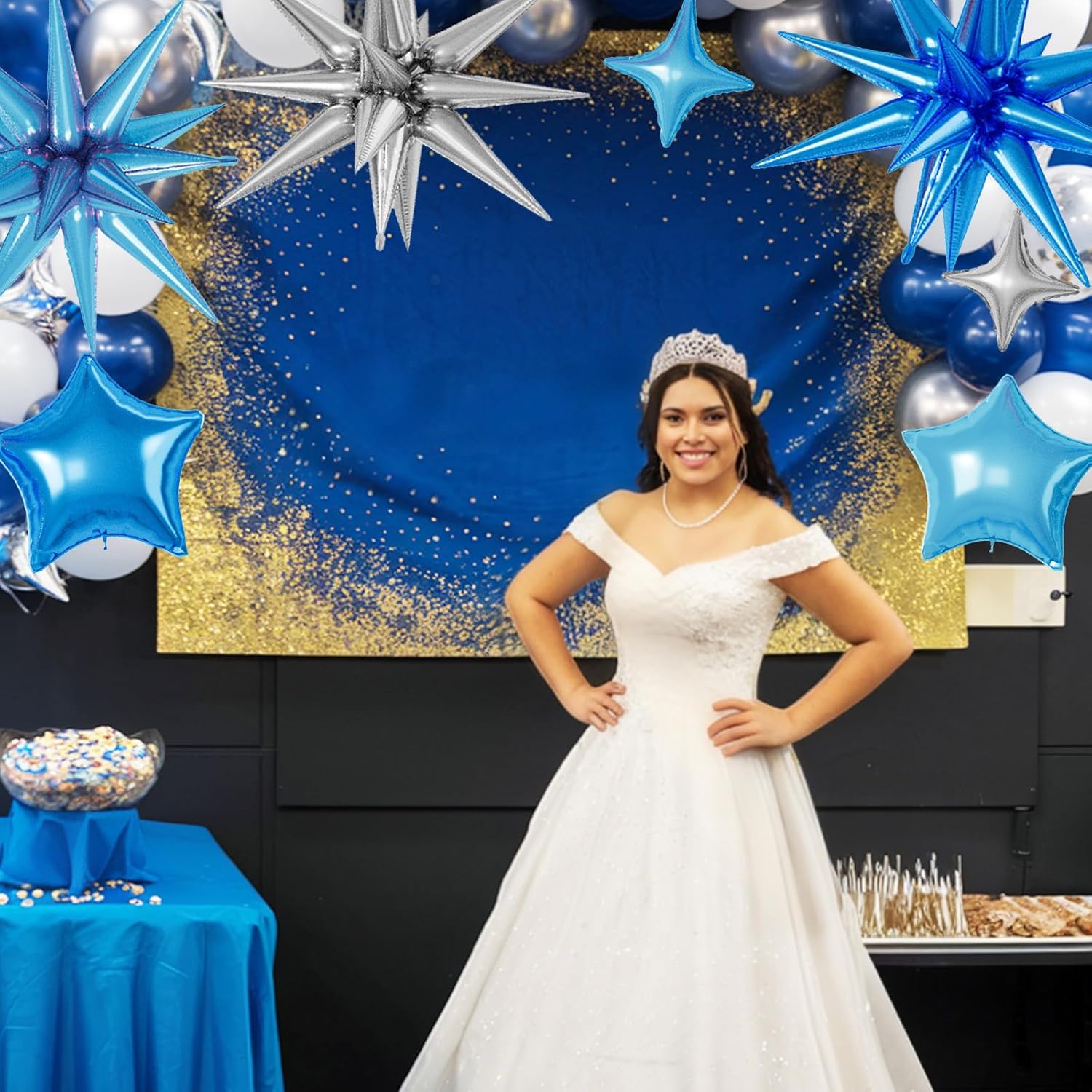 - ăBlue Silver Star BalloonsăThe package includes:6pcs 22-inch Star-Shape balloons(Light Blue*2,Blue*2,Silver*2), 4pcs 10-inch Four-Pointed Star balloons(Light Blue*2,Blue*1,Silver*1), 3pcs 18-inch Five-Pointed Star balloons(Light Blue*1,Blue*1,Silver*1), 3pcs 10-inch Five-Pointed Star Shape balloons(Light Blue*1,Blue*1,Silver*1),1 dispense and 1 straw. These foil star balloons are Great for birthdays, weddings, baby showers, and engagement parties