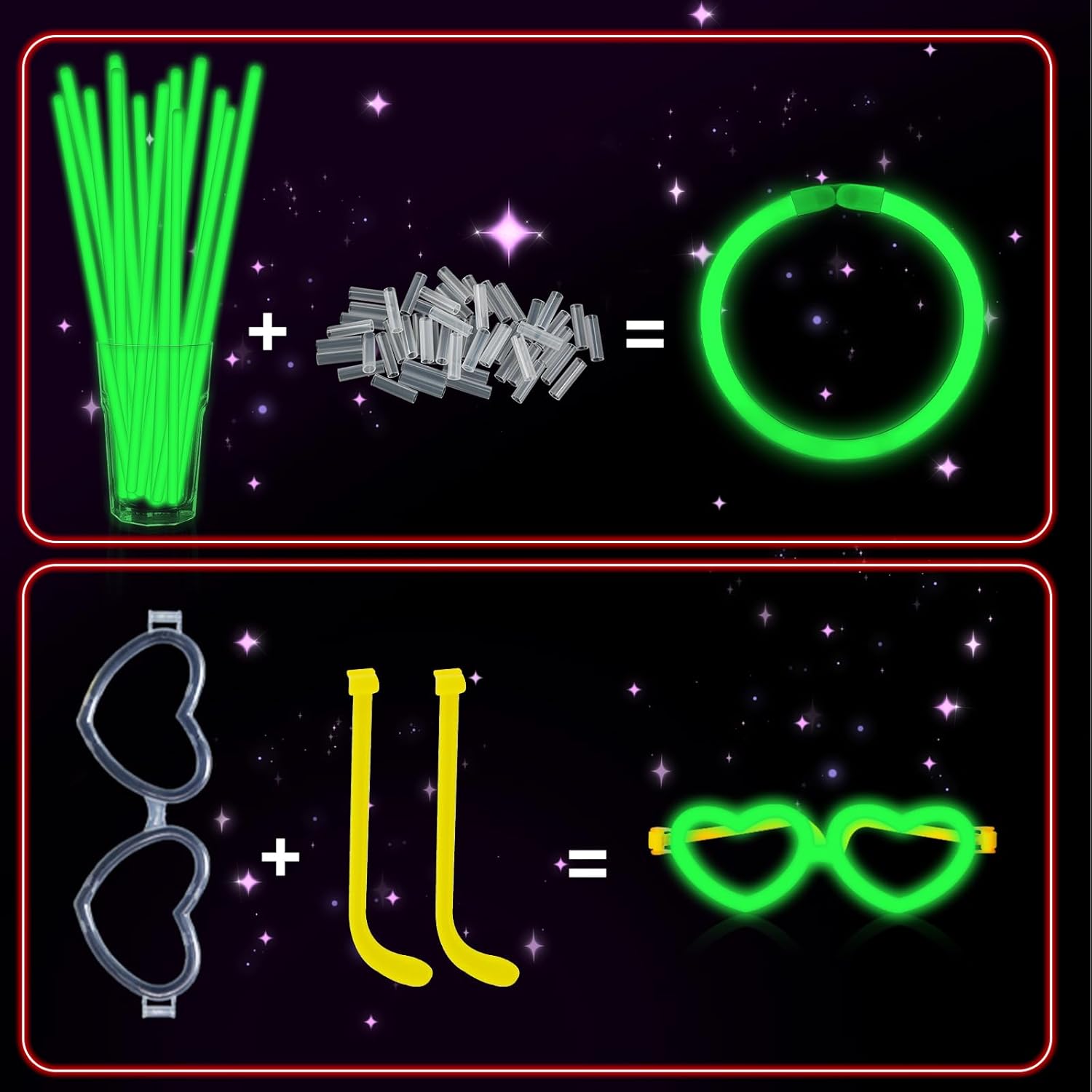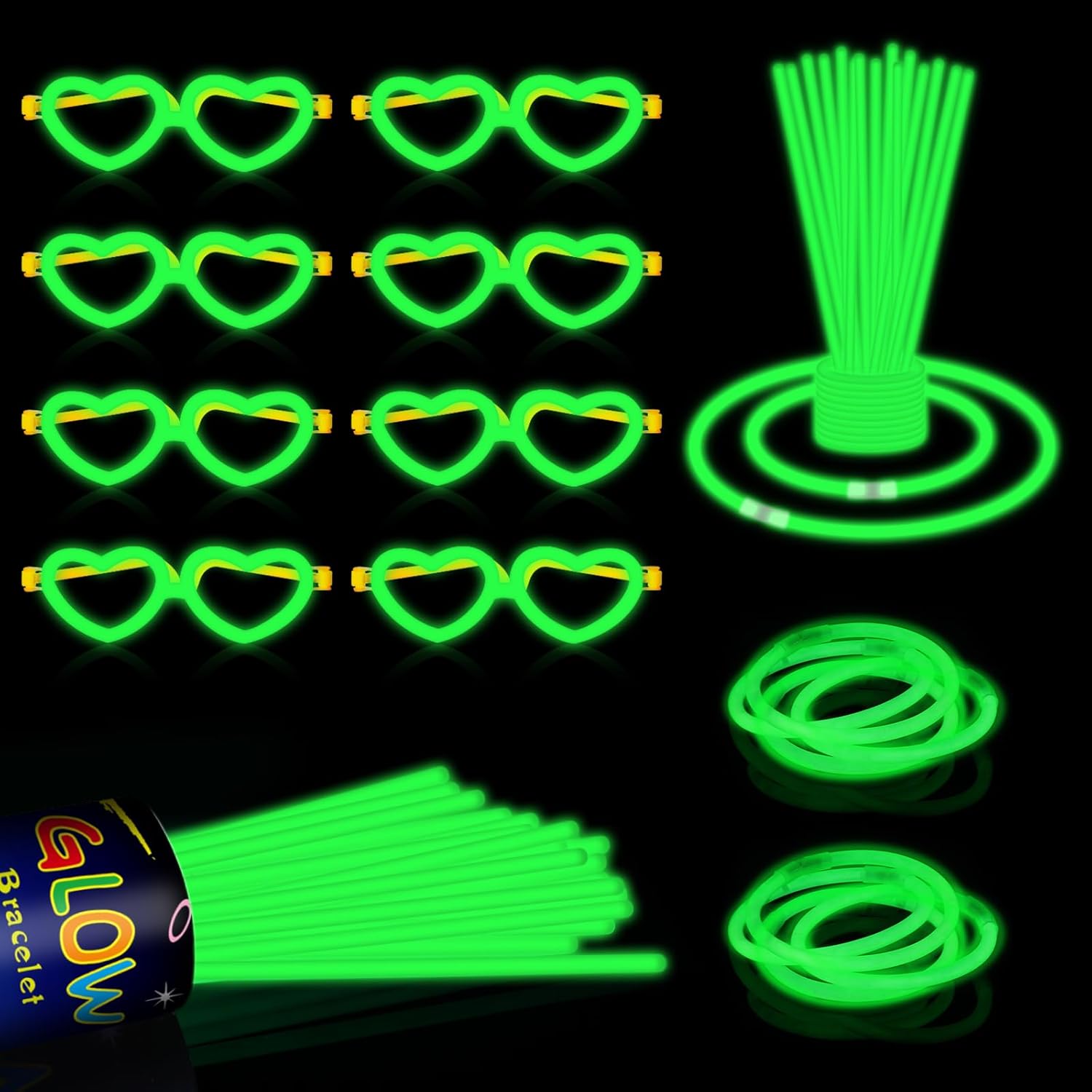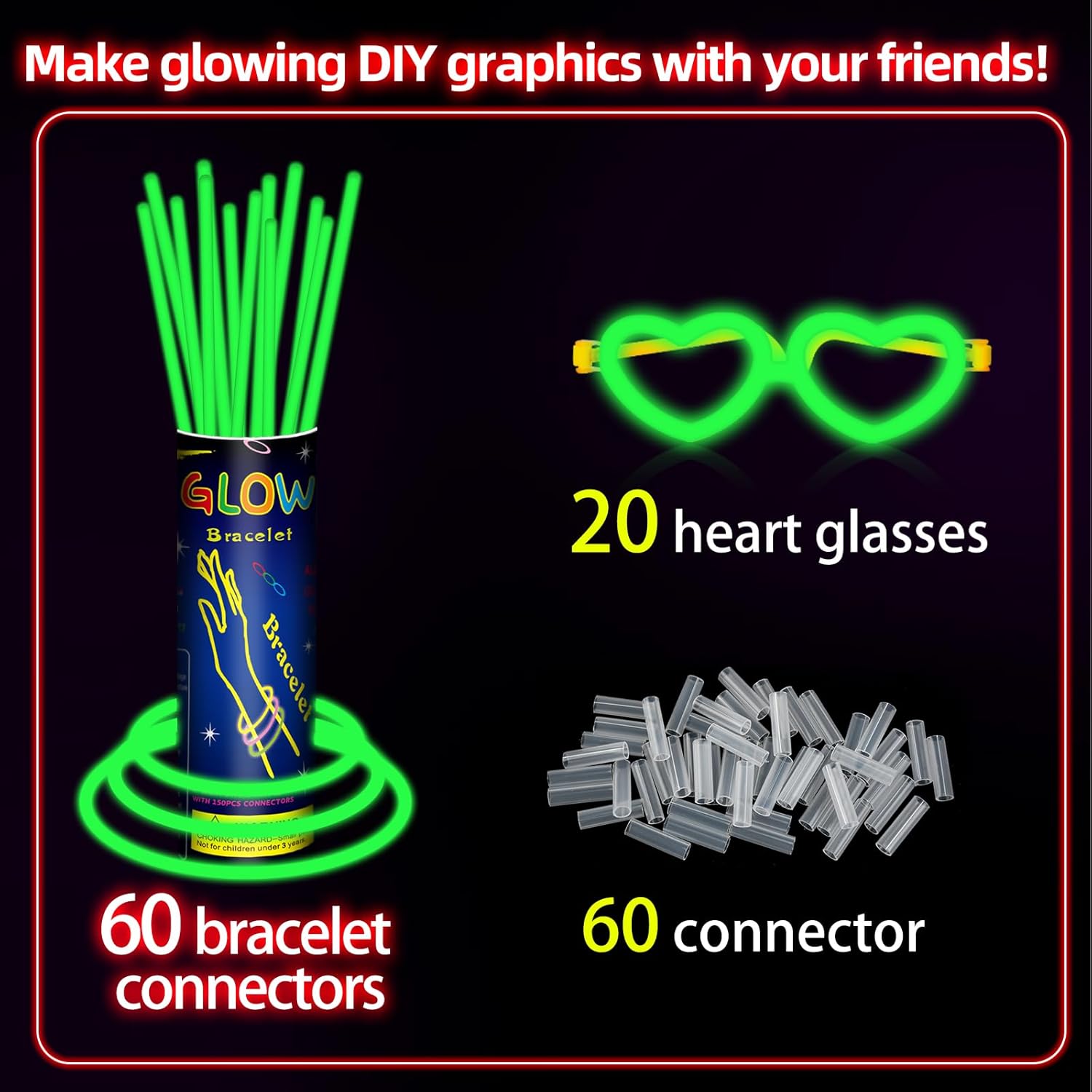 - 20 Set Glow In The Dark Party Supplies: You will receive 60 glow sticks, 60 connectors and 20 heart glasses, and you can easily make 20 glow stick bracelets and 20 glow heart glasses. Have a fun evening with your friends! (Note: if only 20 glasses are made, there will be an excess of 40 connectors)
