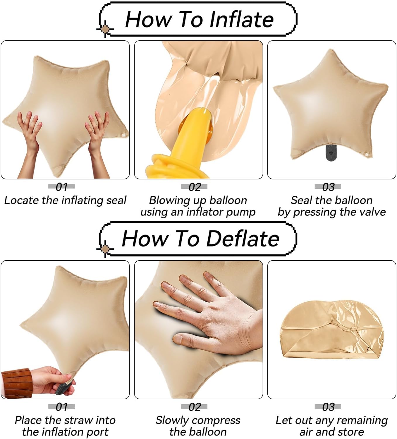 - ăCream Caramel Brown Star BalloonsăThe package includes:6pcs 22-inch Star-Shape balloons(Cream*2,Caramel*2,Brown*2), 3pcs 18-inch Five-Pointed Star balloons(Cream*1,Caramel*1,Brown*1), 7pcs 10-inch Five-Pointed Star Shape balloons(Cream*3,Caramel*2,Brown*2),1 dispense and 1 straw. These foil star balloons are Great for birthdays, weddings, baby showers, and engagement parties