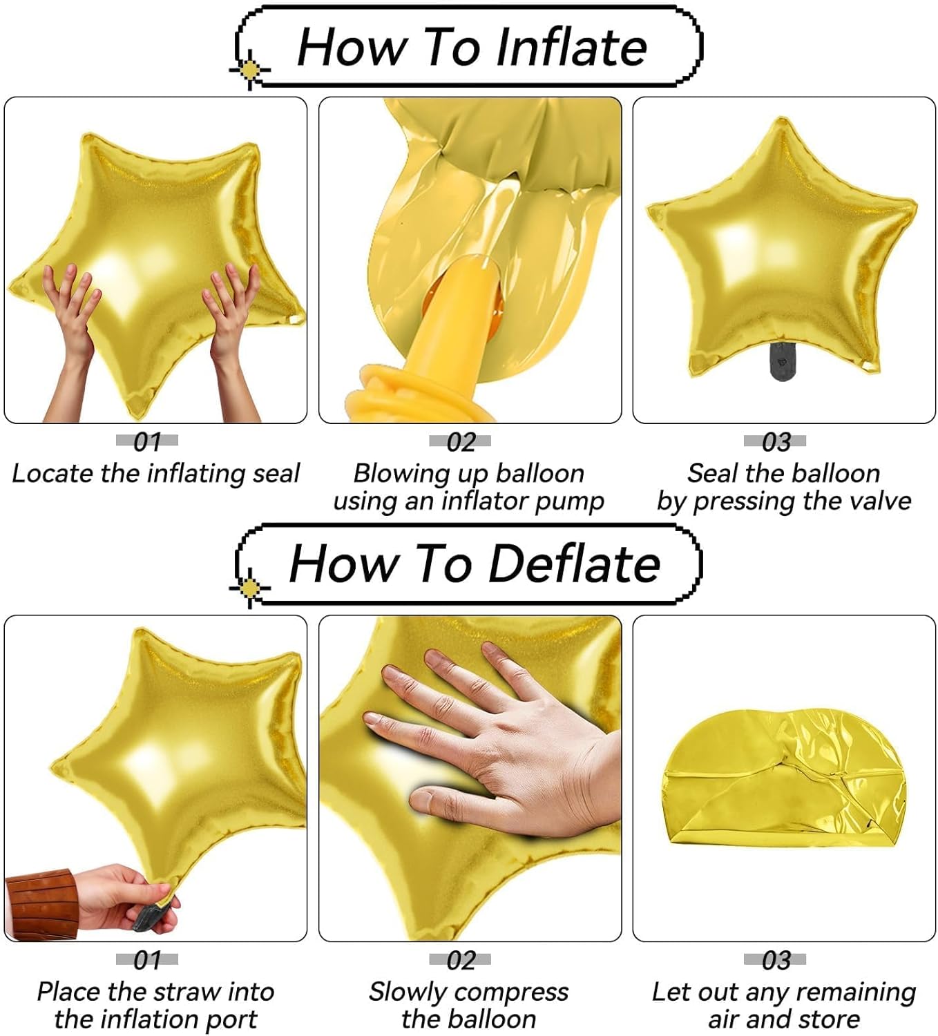 - ăEffortless SetupăInflate with helium or air using a pump and secure easily for polished decor. These Star Foil balloons are simple to assemble and reusable for multiple events, making decorating quick and effortless.