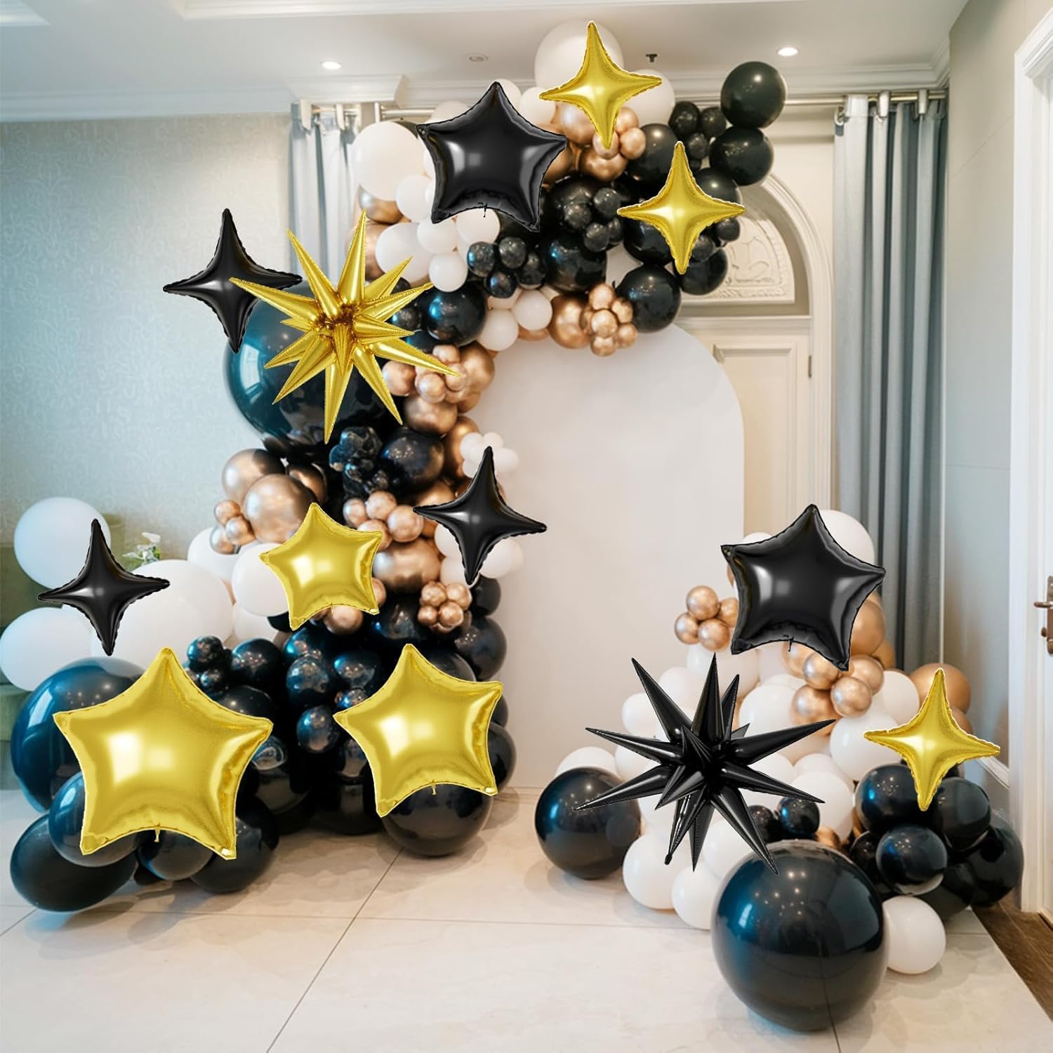 - ăGold Black Star BalloonsăThe package includes:6pcs 22-inch Star-Shape balloons(Gold*3,Black*3), 4pcs 10-inch Four-Pointed Star balloons(Gold*2,Black*2), 2pcs 18-inch Five-Pointed Star balloons(Gold*1,Black*1), 4pcs 10-inch Five-Pointed Star Shape balloons(Gold*2,Black*2),1 dispense and 1 straw. These foil star balloons are Great for birthdays, weddings, baby showers, and engagement parties