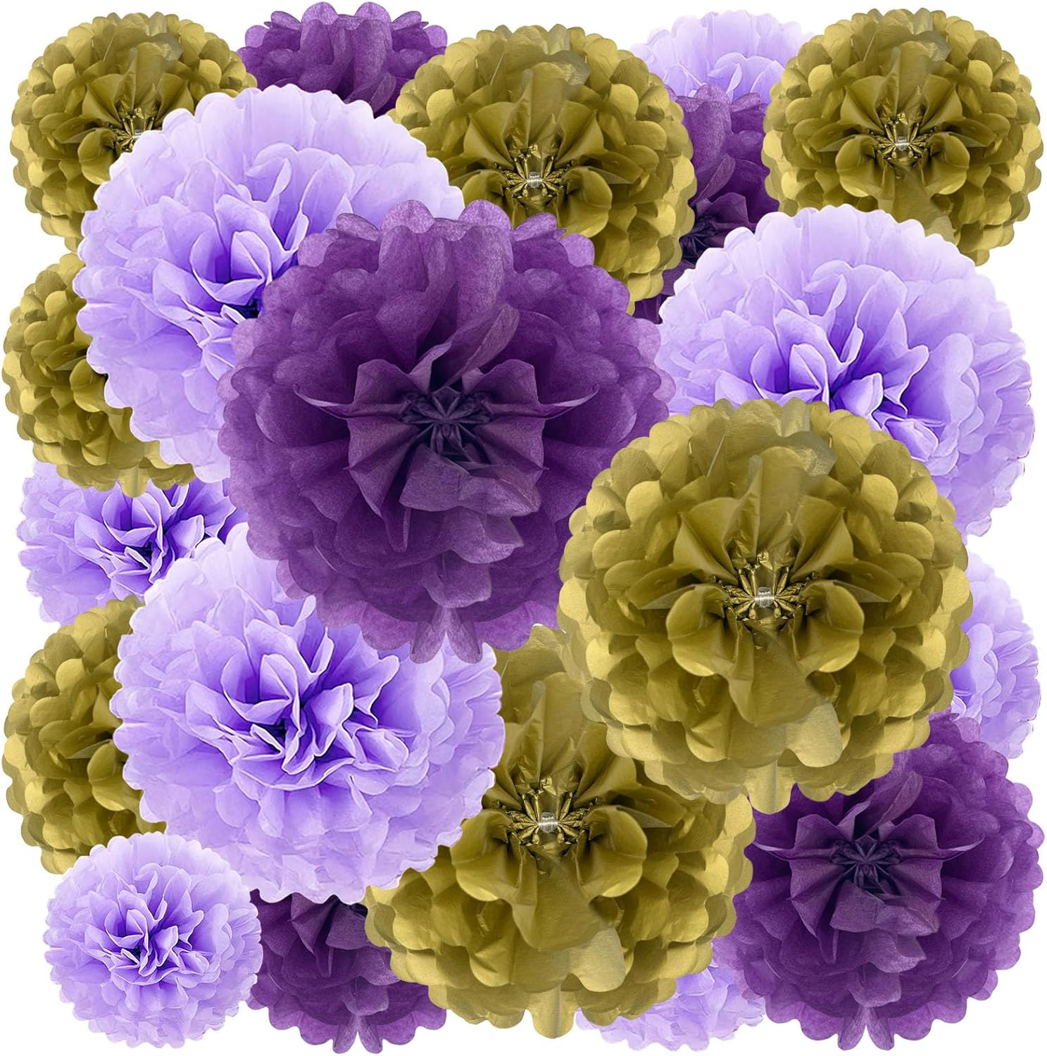 - 【Large Set】18 Pieces purple gold paper flower balls include 6 of 6-inch, 6 of 10-inch, 3 of 12-inch, and 3 of extra-large 14 inch paper pom pom flowers.This tissue flower set comes in 3 different colors including Purple,Light Purple,Gold, which will add charm to your celebration through different color combinations.