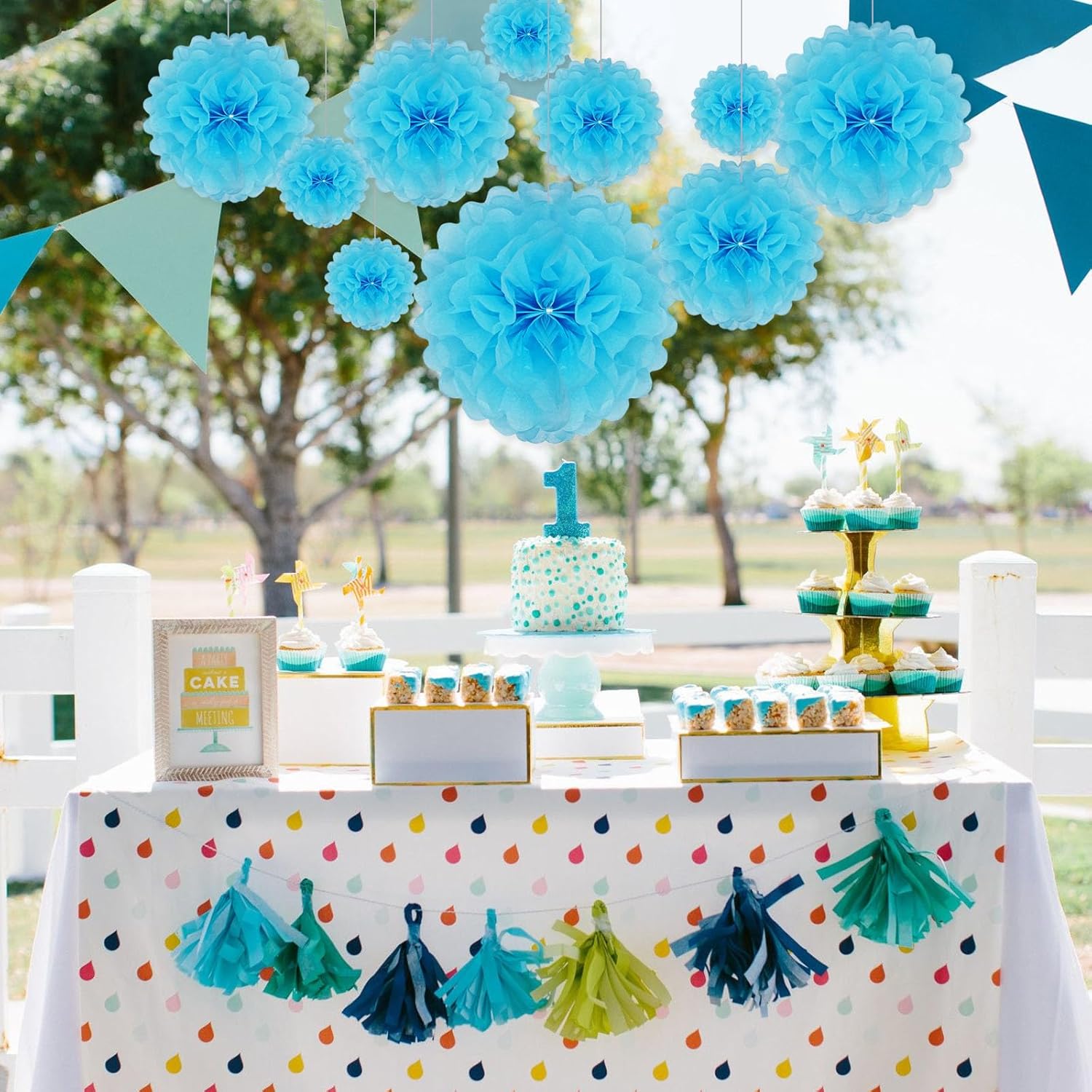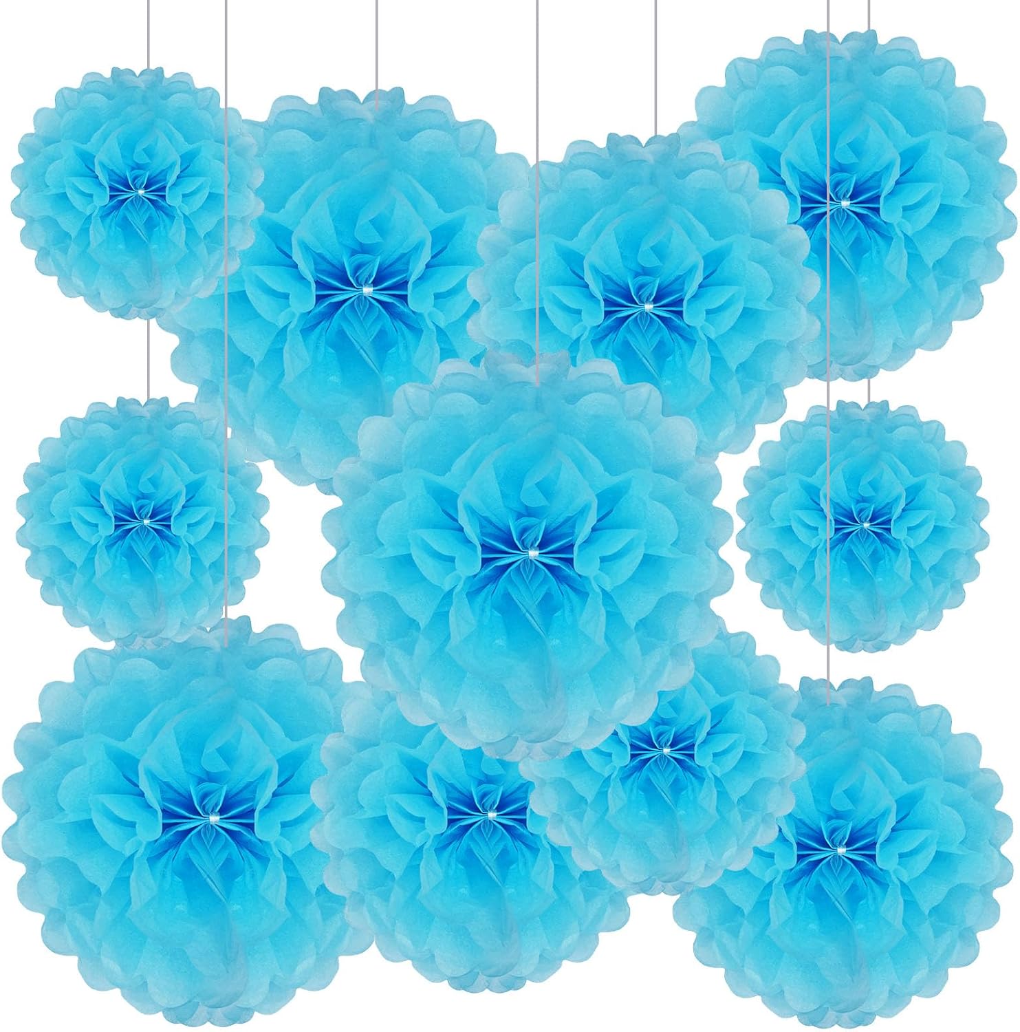- 【Large Set】20 Pieces blue paper flower balls include 6 of 6-inch, 6 of 10-inch, 5 of 12-inch, and 3 of extra-large 14 inch paper pom pom flowers.