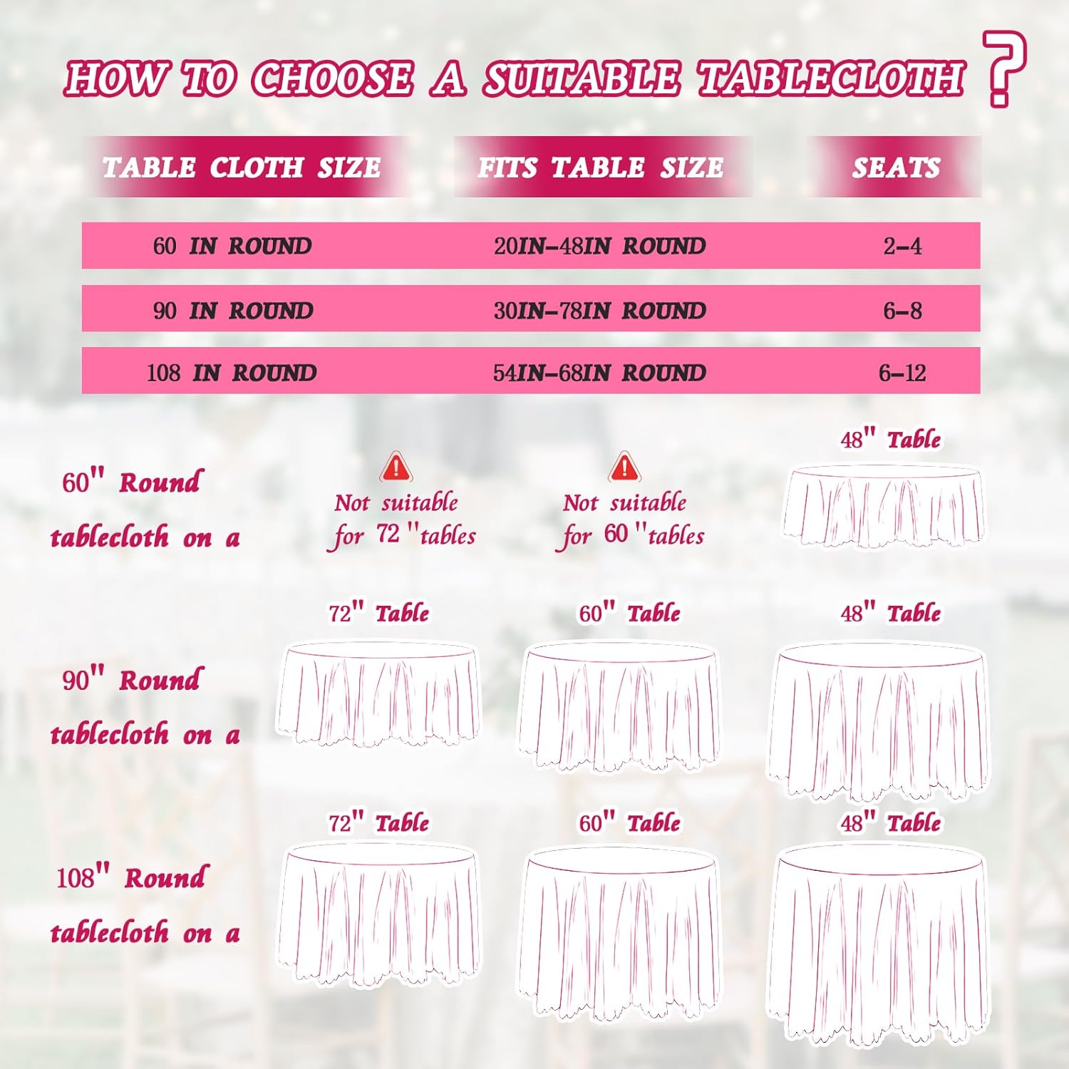 - Widely used scenarios: Round table cloth is suitable for wedding parties, dances, banquet events, birthday parties, restaurant tables, graduation parties, and daily dining tables. It can also be used as decorations for Halloween, Christmas, and Valentine's Day.