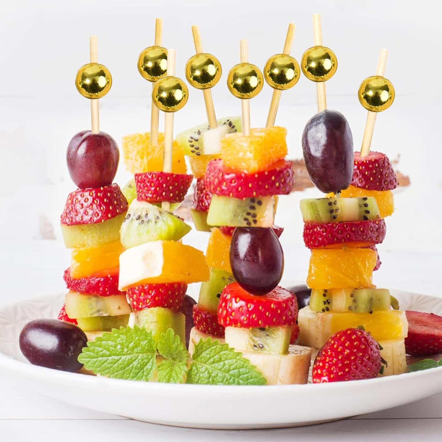 - Sturdy And Long: Appetizer skewers are made of high-quality natural bamboo, the surface is smooth and burr-free, and the gold ball at the end makes it easier to hold and gives you a comfortable feeling of use. Compared to plain toothpicks, ours are sturdy and long enough to not break easily and you can insert various foods more easily.