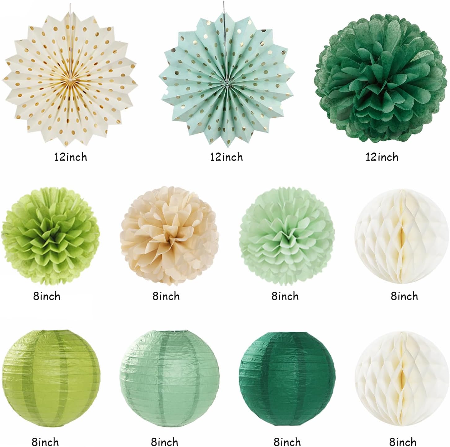 - 【Sage green champagne party kits】This kits include 1pcs bride to be banner,1pcs circle dots paper banner, 4pcs tissue pom poms:3pcs 10" and 1pcs 12",3pcs 8inch paper honeycomb ball 2pcs 8 inch paper lantern, 4pcs 12inch paper flower fan, 6pcs paper swirls hanging streamers.