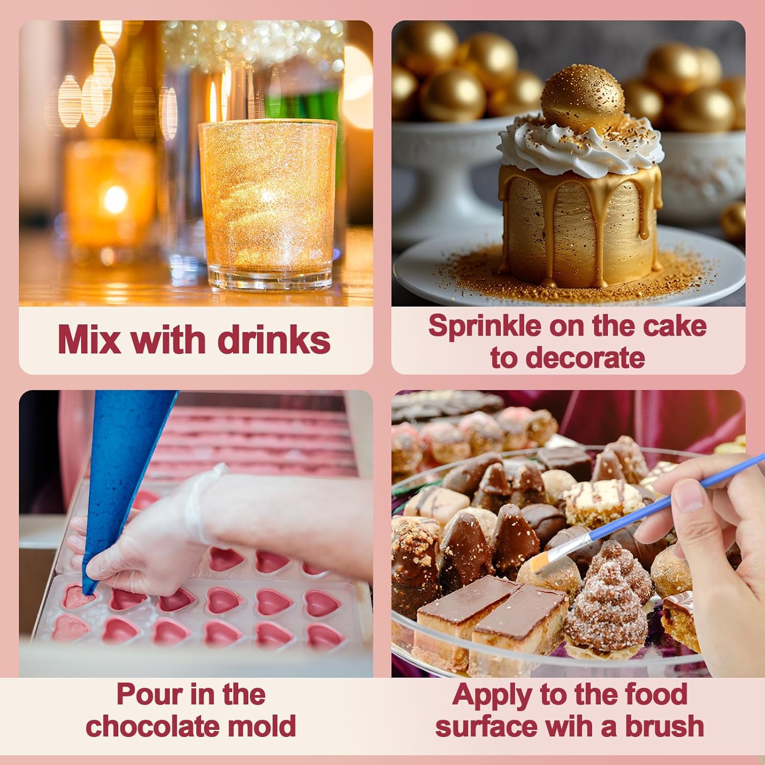 - ✔Wide Applications - Our food grade edible glitter is perfect for for decorating cakes, cocktails, chocolates, cookies, fruits or beverages.Available in various shades, it creates stunning shimmering effects, adding charm to desserts for parties, weddings, or celebratory occasions.