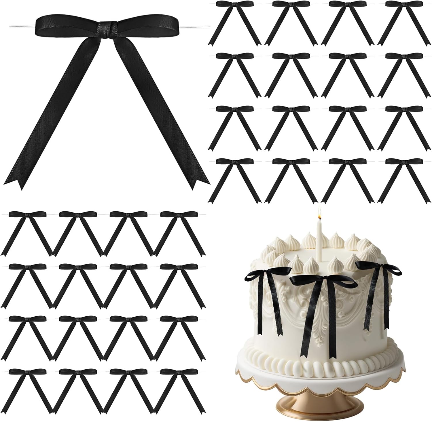 Riceshoot 50 Pcs Twist Tie Bows for Cake 3x4.5 Inch Satin Ribbon Bows for Gift Wrapping Treat Bags Craft DIY Wedding Baby Shower Birthday Party(Black)