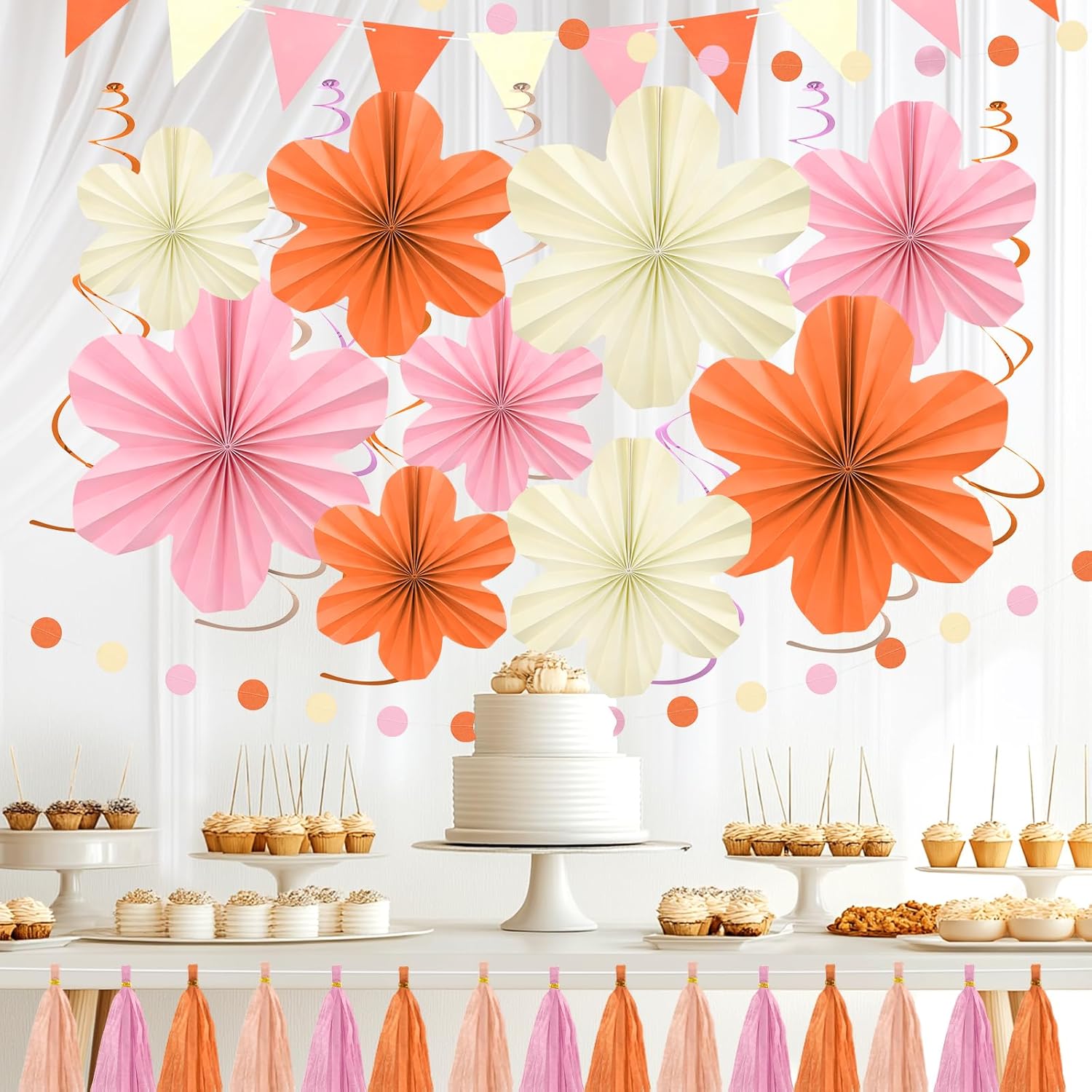 - Orange Party Decorations: Our pink and orange paper fans decorations kit includes 3 pcs 12’’ paper flowers, 3 pcs 10’’ paper flowers, 3 pcs 8’’ paper flowers, 9 pcs hanging swirls, 1 pcs 6.56ft tasseled garland, 1 pcs 6.56ft triangular pennants, 2 pcs circle dot garland, 2 pcs ribbon.