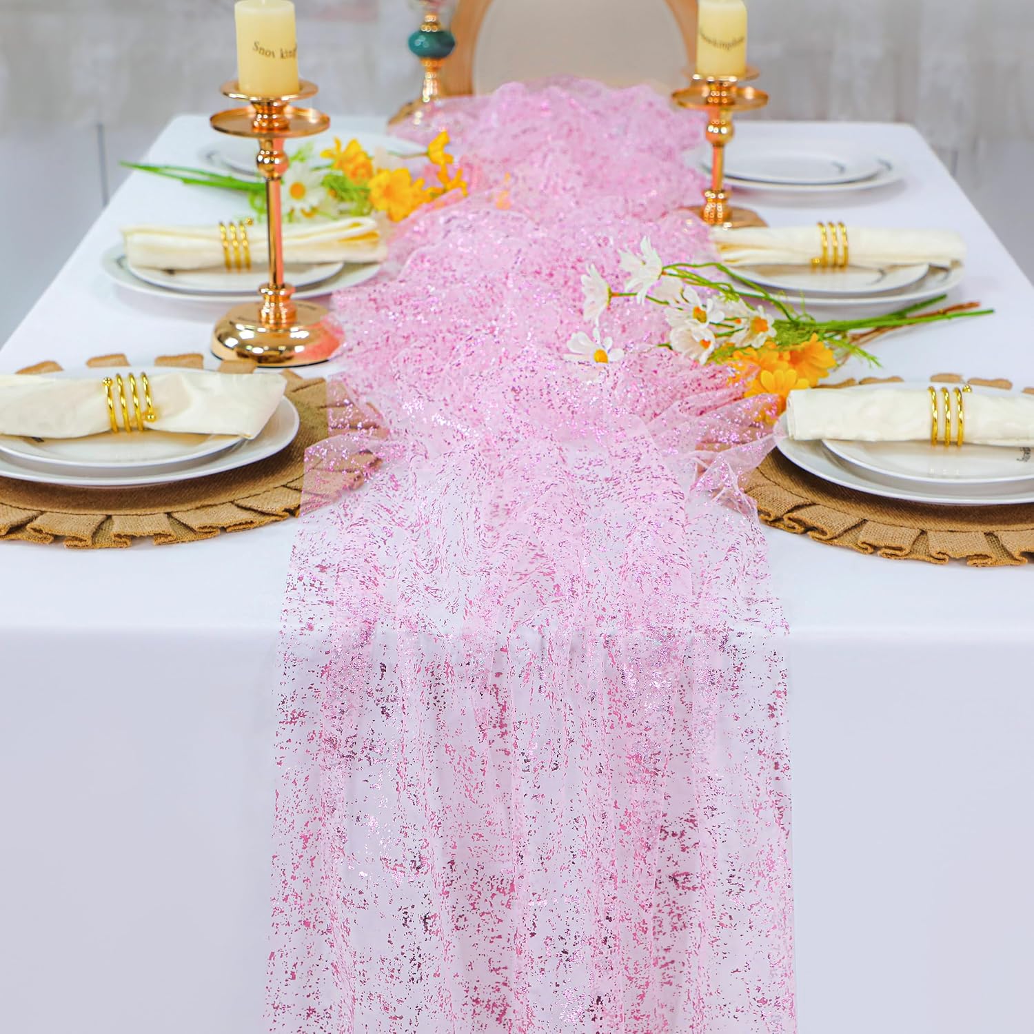 Snowkingdom 10 FT Pink Table Runner, Sequin Glitter Sheer Chiffon Gauze Cheesecloth Pastel Runner 120 Inch , Pink Party Table Decoration for Birthday Wedding Bridal Baby Shower Spring Summer Holiday