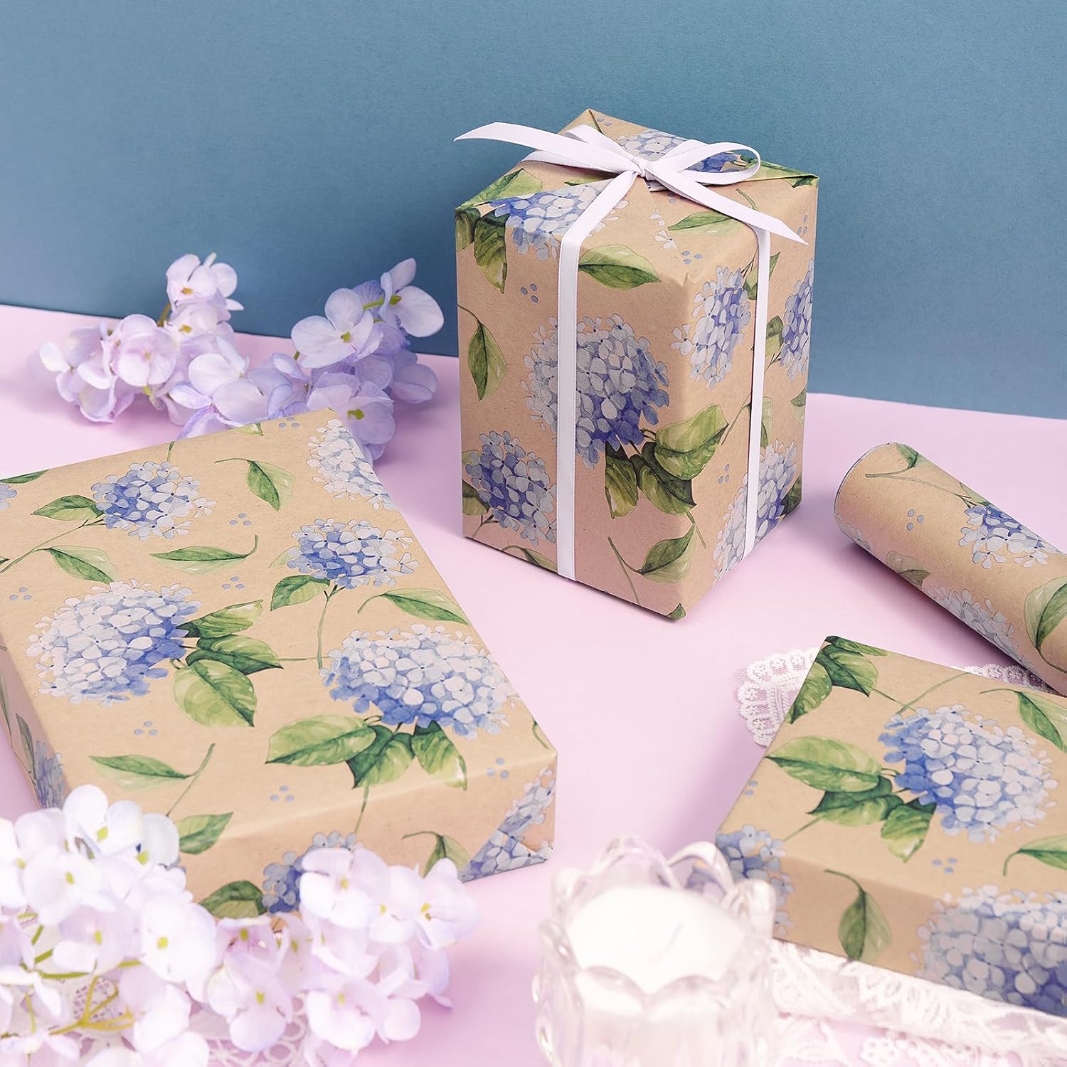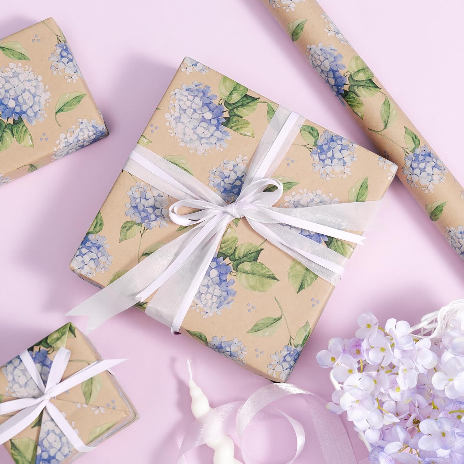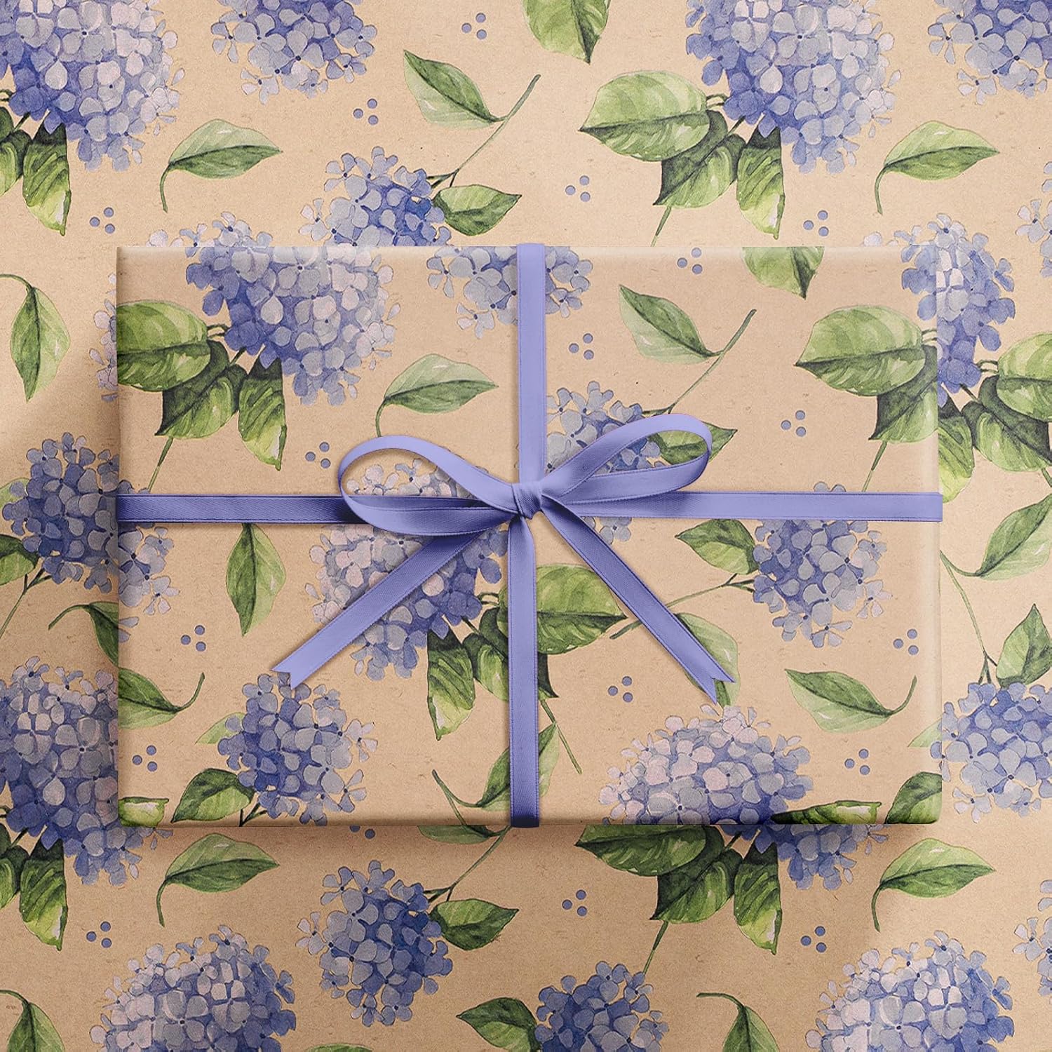 - Elegant Wrapping Paper: Features purple hydrangea flowers with delicate blooms, paired with vibrant green leaves against a warm kraft paper background. Perfect for adding a refined touch to any gift, it brings the beauty of blooming flowers and natural elements into your wrapping