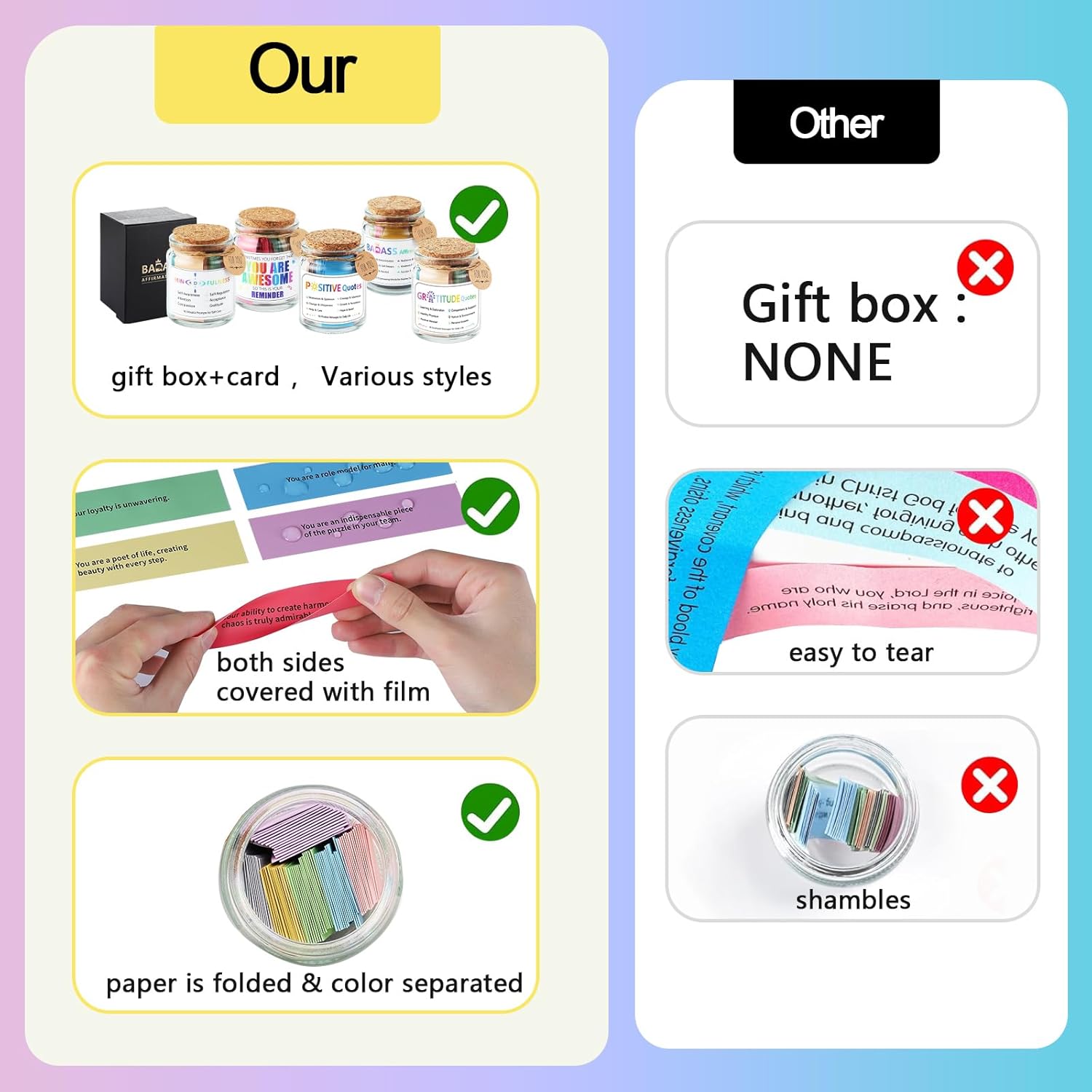 - Anytime, Anywhere, Convenient Gratitude: Whether it's the living room, bedroom, or study at home, or the picnic spot outdoors, during a trip, this glass jar can come in handy at any time. Start a gratitude ceremony in the morning, draw strength during a work break, make a gift on a leisurely afternoon, and record beauty at night, making gratitude integrate into every moment of life