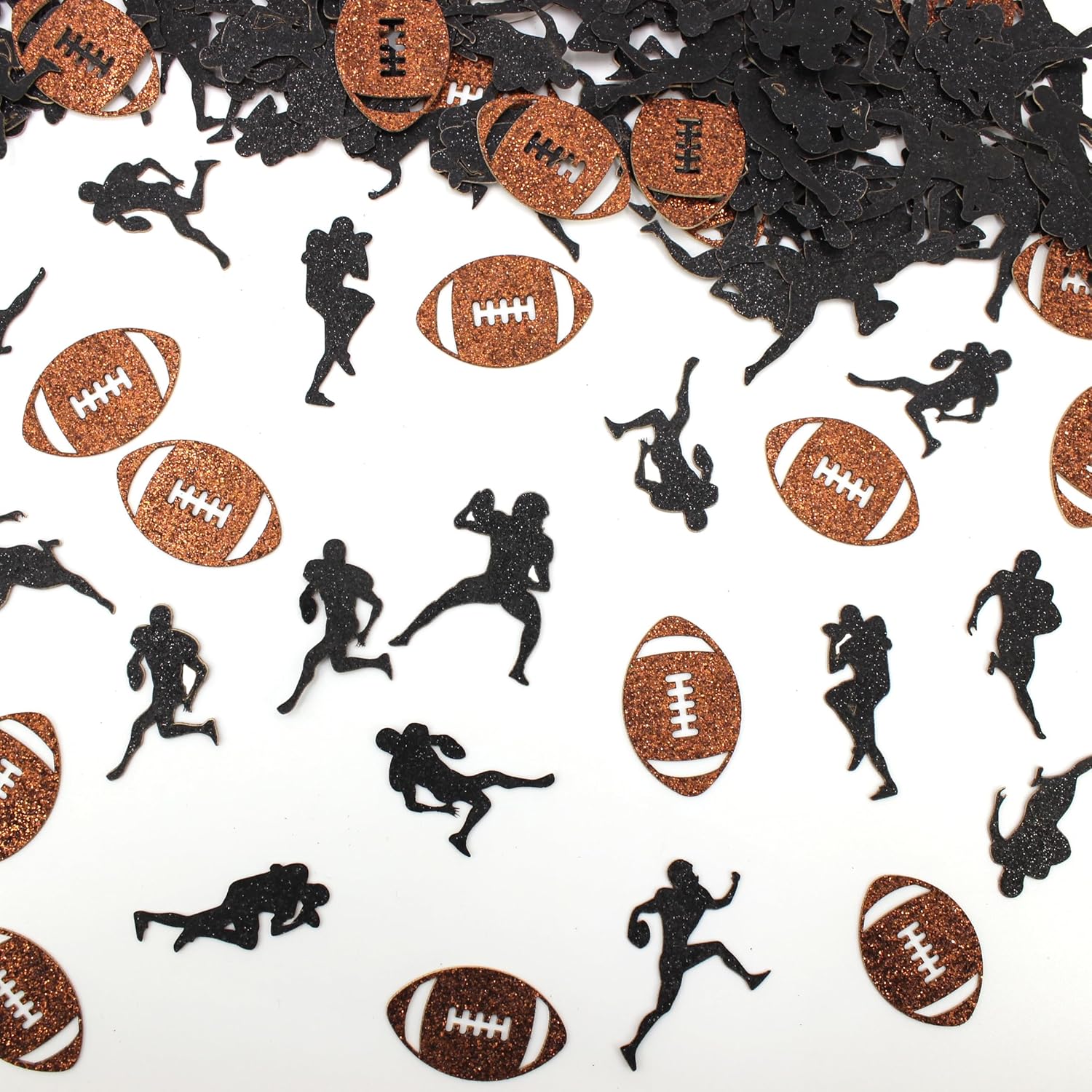 - Great football themed party decorations.The black/brown glittery football confetti featured with mix football players shape and football shape,perfect for football birthday party decorations for boy/adult men ,baby first birthday decorations,daily or festive sport celebration,even for baby shower,it is great.