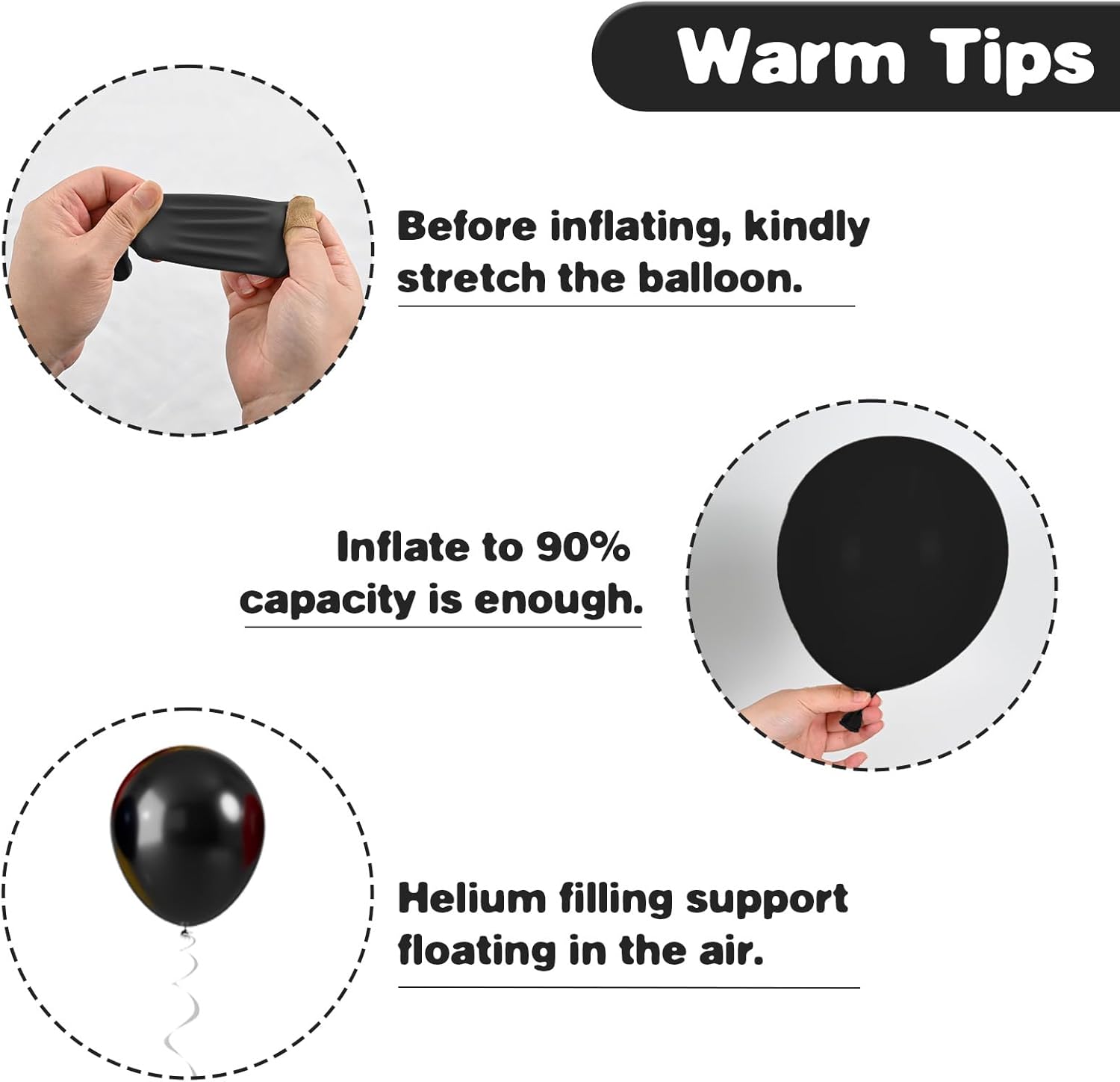 - Friendly Reminders: After inflating, you may notice the balloon colors appear lighter, and lighting can also affect their appearance. To keep them looking their best, avoid sharp objects, rough surfaces, and direct sunlight. Store any unused balloons in a cool, dry place to maintain their quality. If you have any questions, please feel free to reach out!