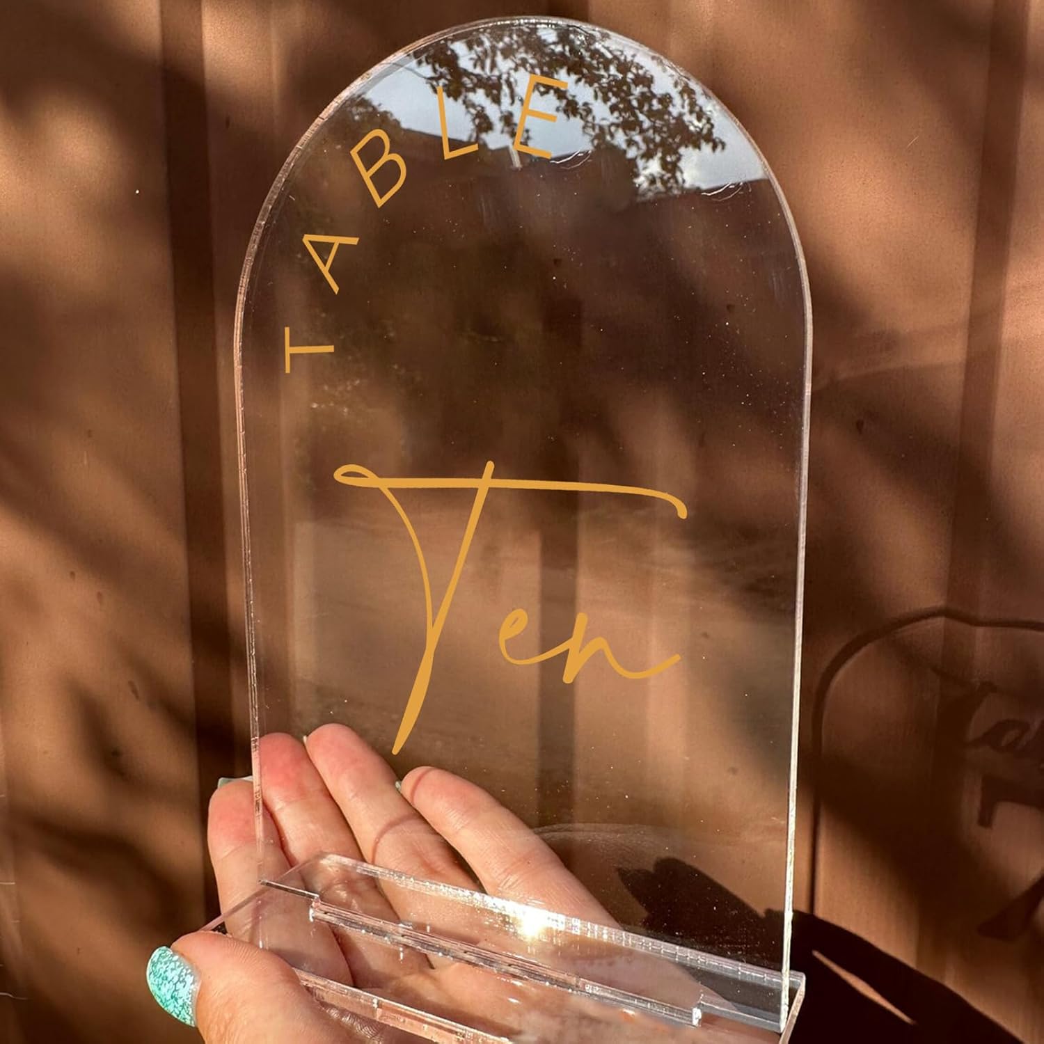 - PREMIUM QUALITY: These clear arch table numbers with stands are made from high quality clear acrylic and then printed with gold letters in a simple arch design that won't go out of style and will last a long time.