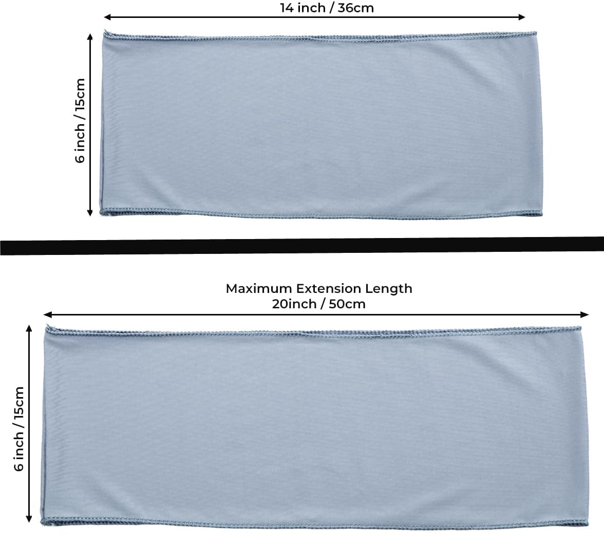 - đź’š PERFECT SIZE: High quality spandex with good elasticity, stretch to fit almost chairs. It is 90% Polyester and 10% Spandex. Size: 5.9" x 14" Or 14cm (W)*35cm(L). Fit for all type chairs (35-50CM Chair Back Width).