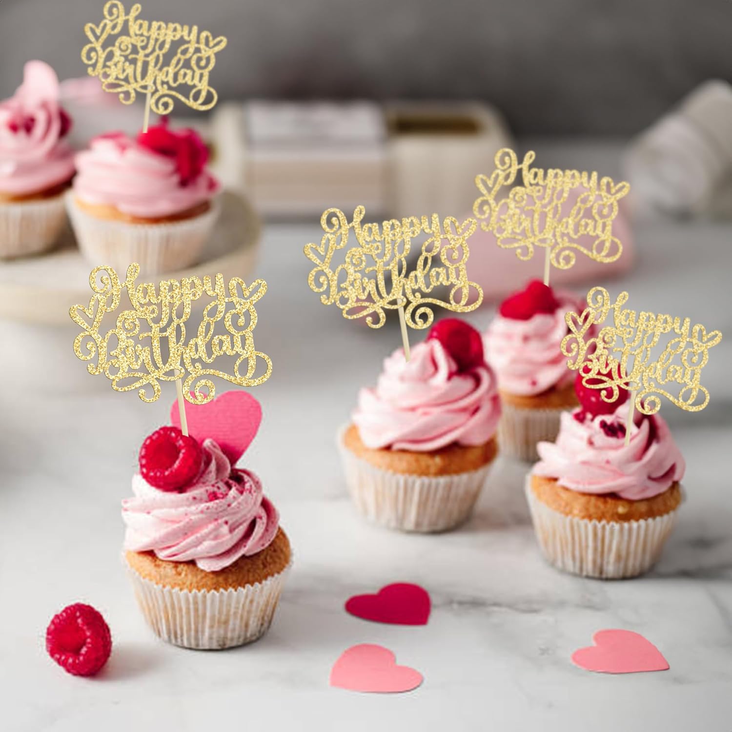 Gyufise 24Pcs Happy Birthday Cupcake Toppers Glitter Happy Birthday Cupcake Picks for Celebrating Happy Birthday Anniversary Theme Party Cake Decorations Supplies Gold