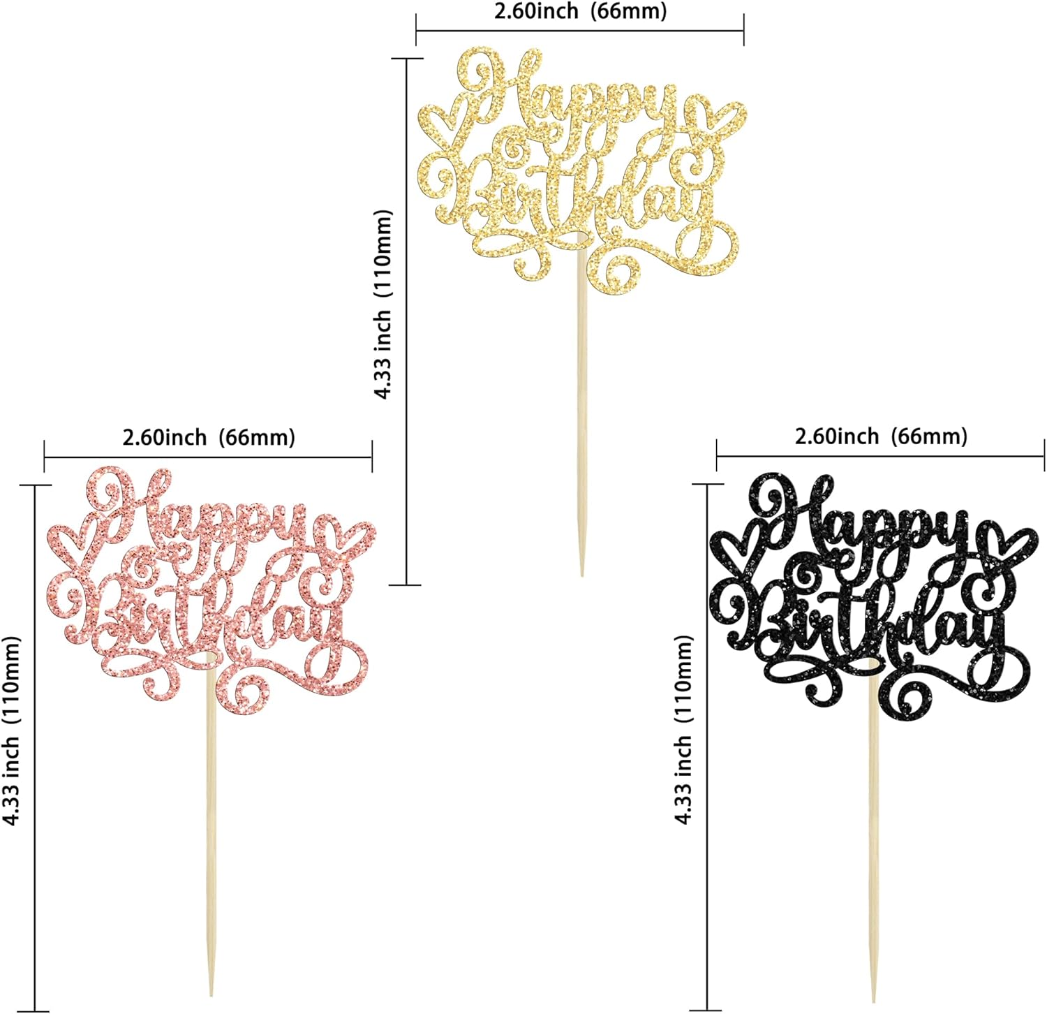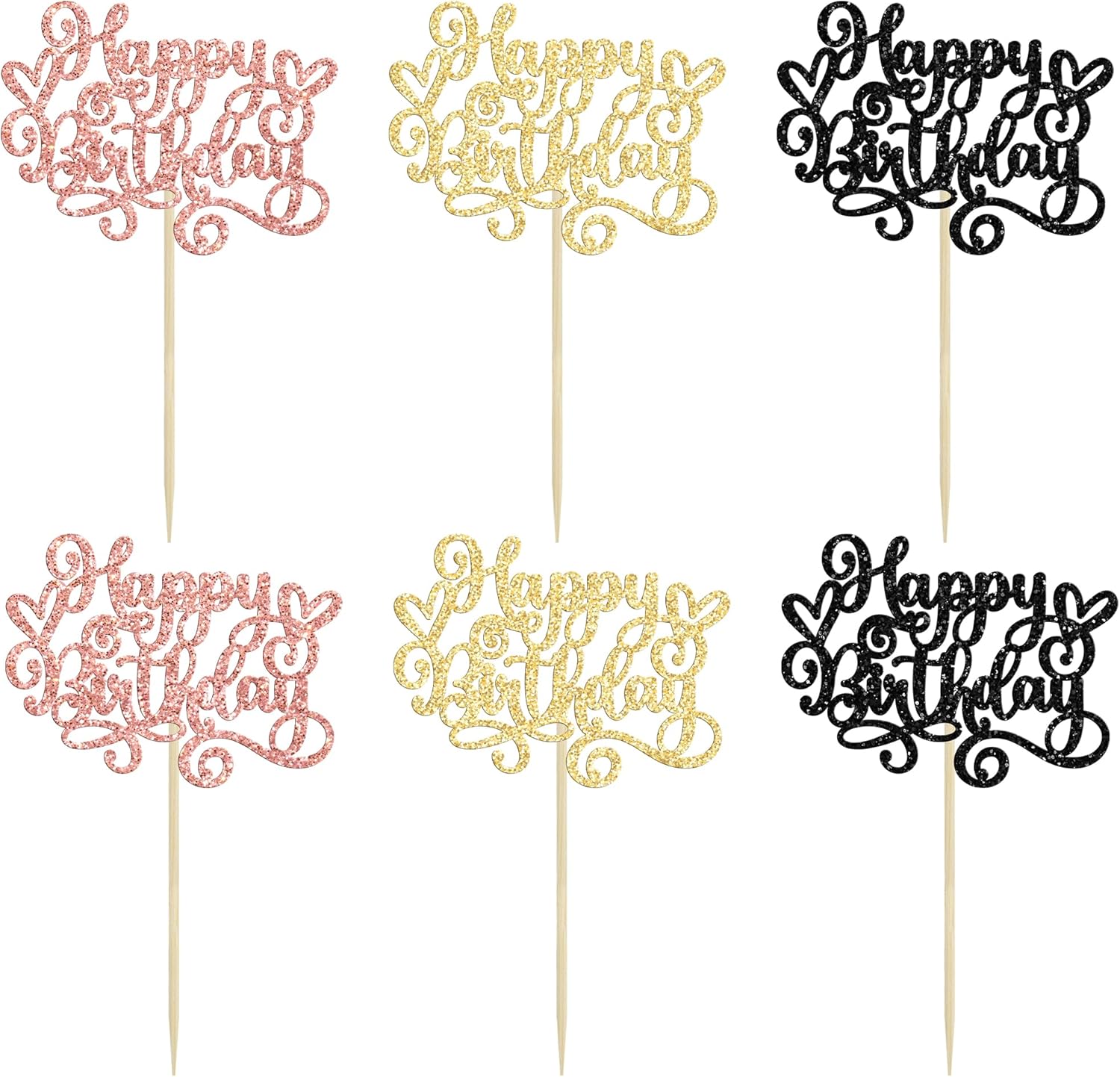 Gyufise 24Pcs Happy Birthday Cupcake Toppers Glitter Happy Birthday Cupcake Picks for Celebrating Happy Birthday Party Decor Anniversary Theme Party Cake Decorations Supplies Black Gold Rose Gold