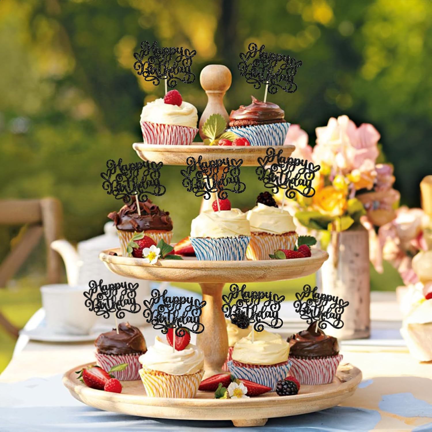 Gyufise 24Pcs Happy Birthday Cupcake Toppers Glitter Happy Birthday Cupcake Picks for Celebrating Happy Birthday Anniversary Theme Party Cake Decorations Supplies Black