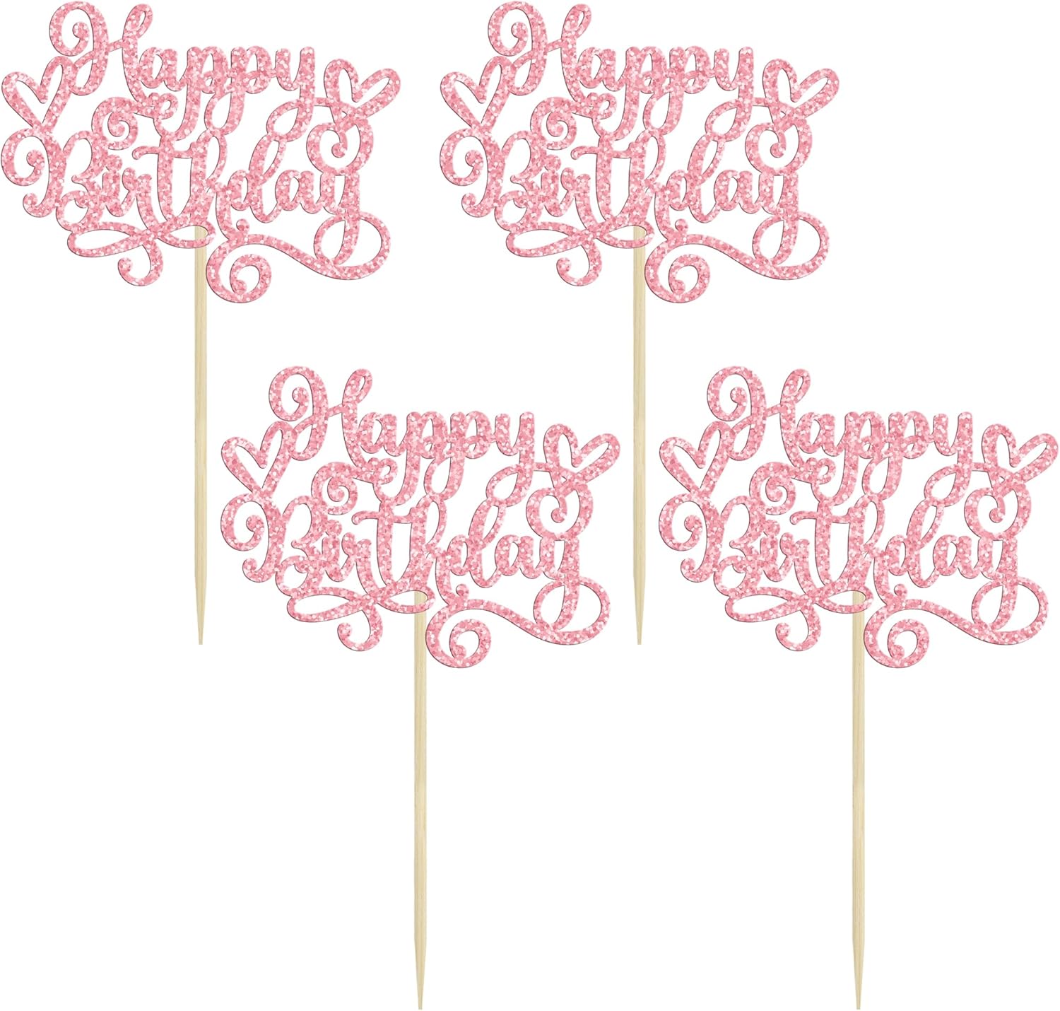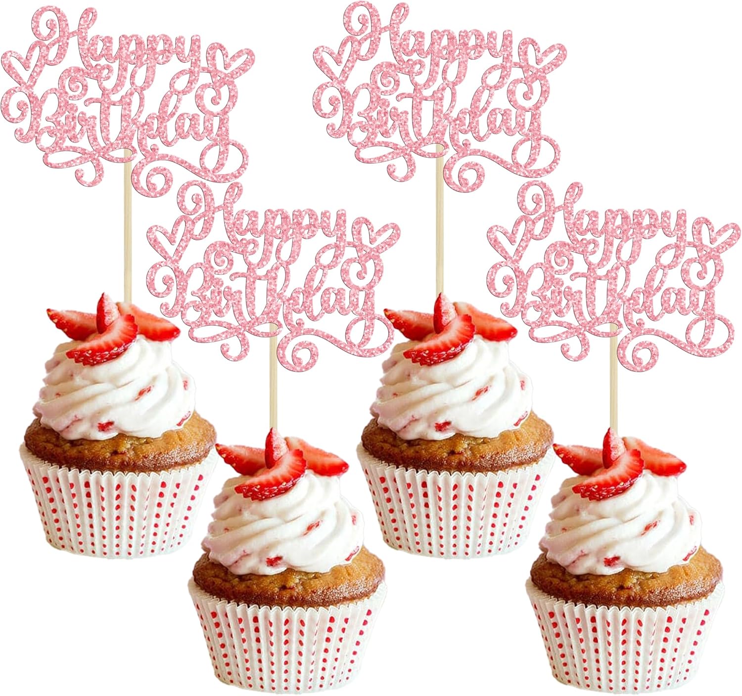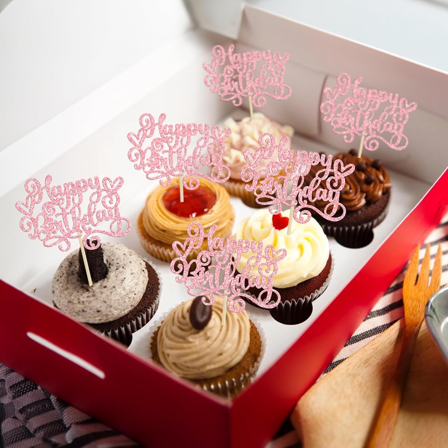 Gyufise 24Pcs Happy Birthday Cupcake Toppers Glitter Happy Birthday Cupcake Picks for Celebrating Happy Birthday Anniversary Theme Party Cake Decorations Supplies Pink