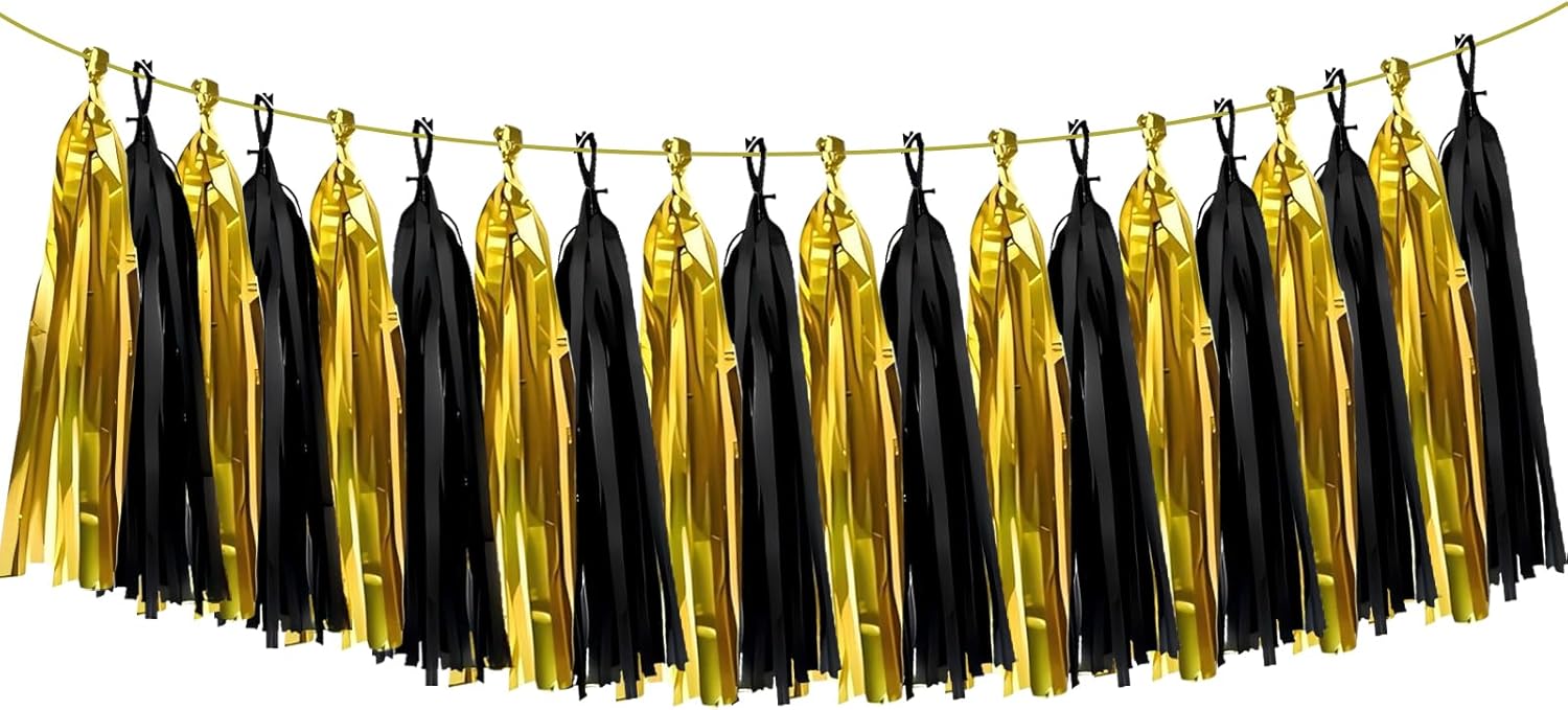 - PACKING:20PCS Tissue Paper Tassels. Color:Black/Gold. Size: Each tissue paper tassel length: 36cm / 14inch.
