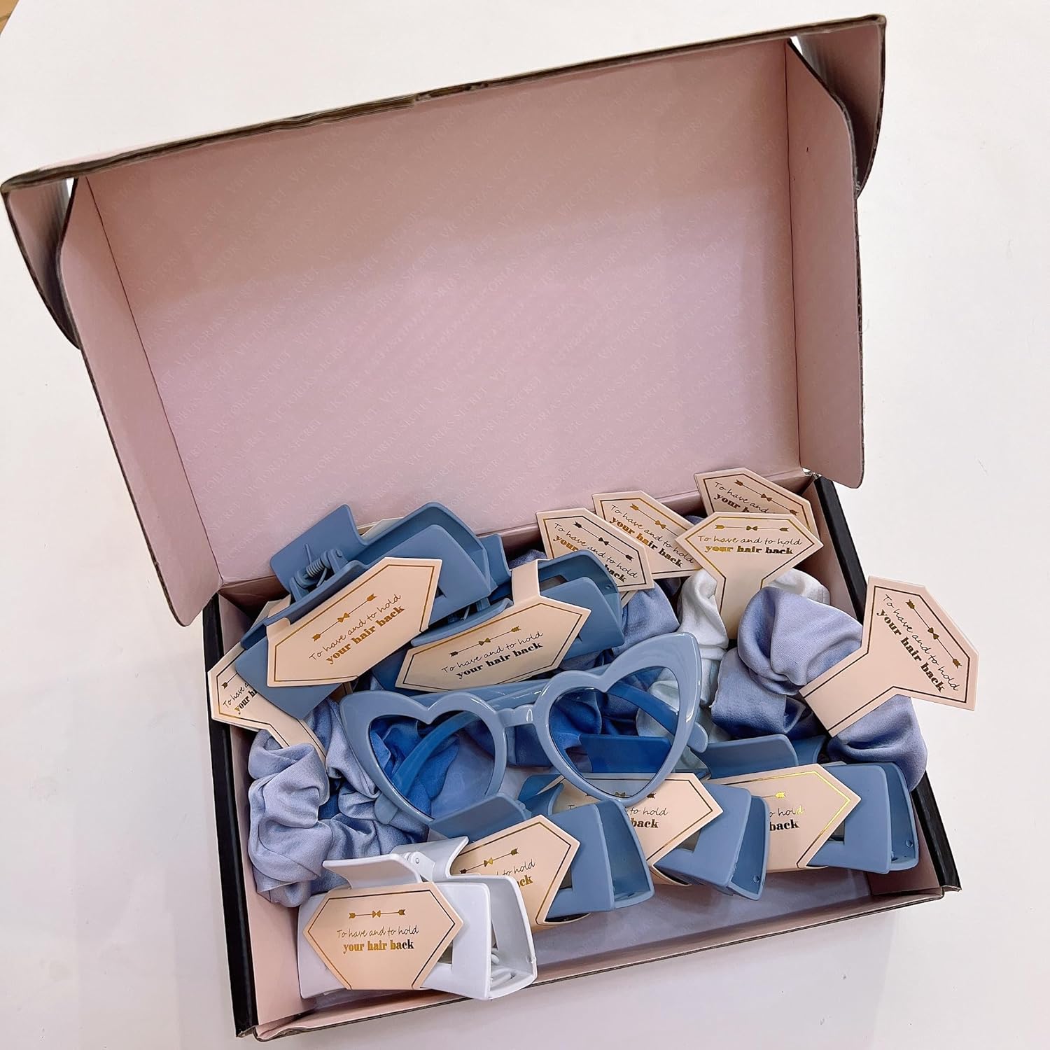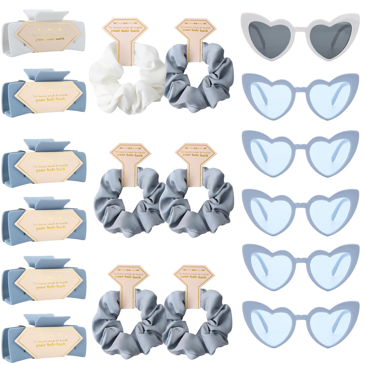 18pcs Bridesmaid Scrunchies Proposal Gifts Bachelorette Hair Claws Clips Girls heart sunglasses for Wedding Party Favors(White&Blue)