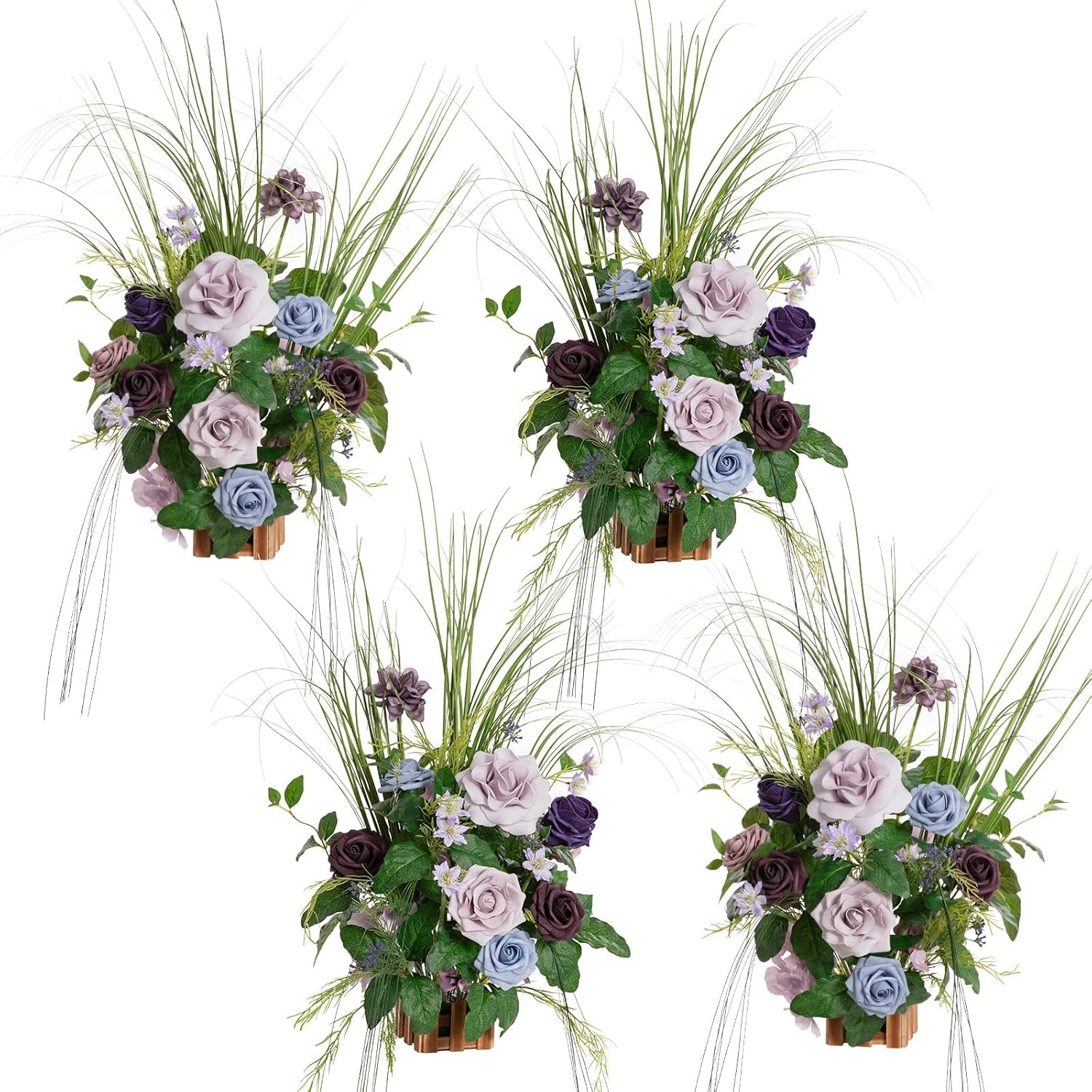 - WEDDING FLORAL DECOR DETAILS: Free-standing flower arrangement x 4, green fixture zip x 4, helps to create a romantic spring, lilac & blue or summer wedding. These pre-made floral arrangements are perfect for decorating the wedding aisle, welcome entrance, table centerpieces, and wedding arch decor.