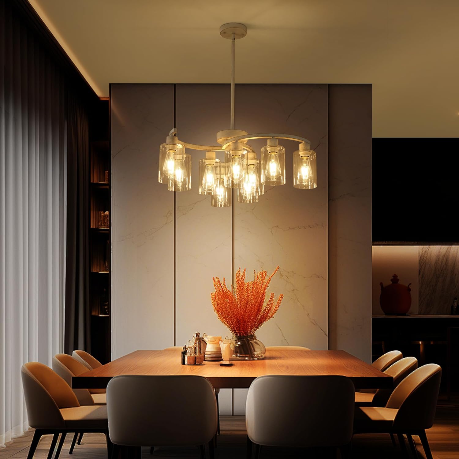 9-Light Antique White Chandelier with Clear Glass Shade, French Country Chandeliers for Dining Room, Adjustable Height Hanging Chandelier for Kitchen Island Living Room Foyer Bedroom